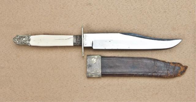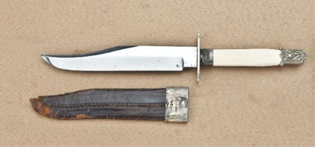 Clipped point bowie knife, circa late 19th to early 20th century, unmarked, 10-1/8” overall, 6” blade with full clip point, measuring approx. 1” across widest portion. The blade is nicely ground and well made, and shows a genuine ivory grip with silver ferrules and German silver crossguard. A silver mounted scabbard is included and missing its tip. The blade shows some polishing. The grip shows a few cracks but is good with just normal patina. Very much English or American in style and good quality. Est: $250 - $500
