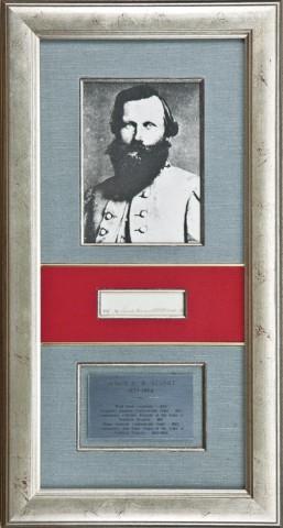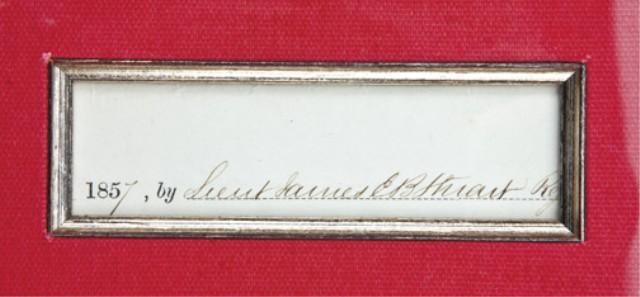 Clipped signature of James E. B. Steward (J.E.B. Stewart) 1857, signed as a Liutennant. Approx. 1-1/4” by 4-1/8”. Professionally framed and matted in southern patriotic motifs, red and grey colors, approx. 22 1/2” by 13-1/4”. Broker’s name on back, Museum of Historical Documents. Jeb Stewart was the right hand of Robert E. Lee throughout his career. Est: $300 - $600