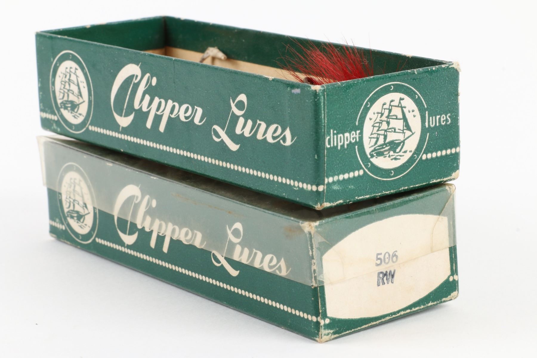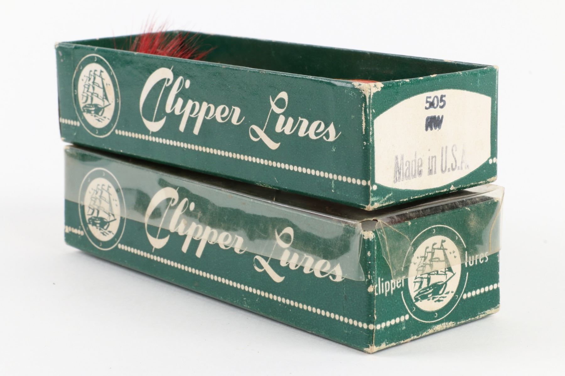 Clipper Lures, United States. Material: Wood. Quantity: 2. Grade: VG. 5.25" boxes. Est. $50-75.