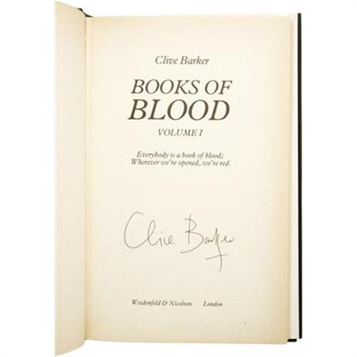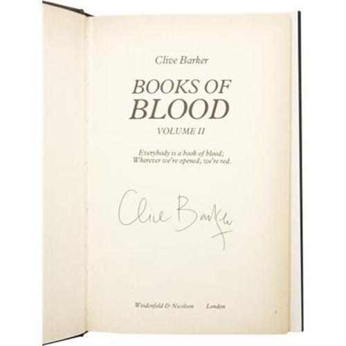 <B>Clive Barker: Signed Limited First Editions of <I>Books of Blood</B></I></B></I> <B>Volumes I-VI</B></I> (London: Weidenfeld & Nicolson, 1985), six volumes, all in black cloth with silver titles, 8vo (5.5" x 9"), dust jackets. All six books signed "<I>Clive Barker</B></I>" on the title page. First hardcover editions of volumes IV, V & VI and first separate hardcover editions of volumes I & II. Originally published in 1984 as six paperbacks from Sphere, with a small book-club hardcover omnibus edition of the first two volumes following. Overall, the books are in fine condition, with mild toning to the text edges. A must for any Barker fan or horror literature collector.<BR><BR><b>Shipping:</b> Books & Catalogs (<a target="_blank" href="http://www.heritageauctions.com/common/shipping.php">view shipping information</a>)