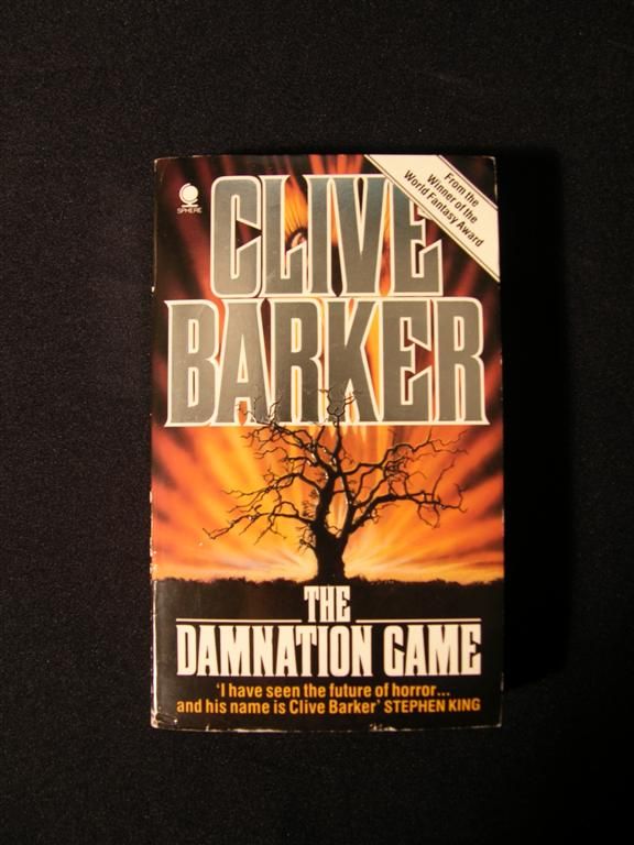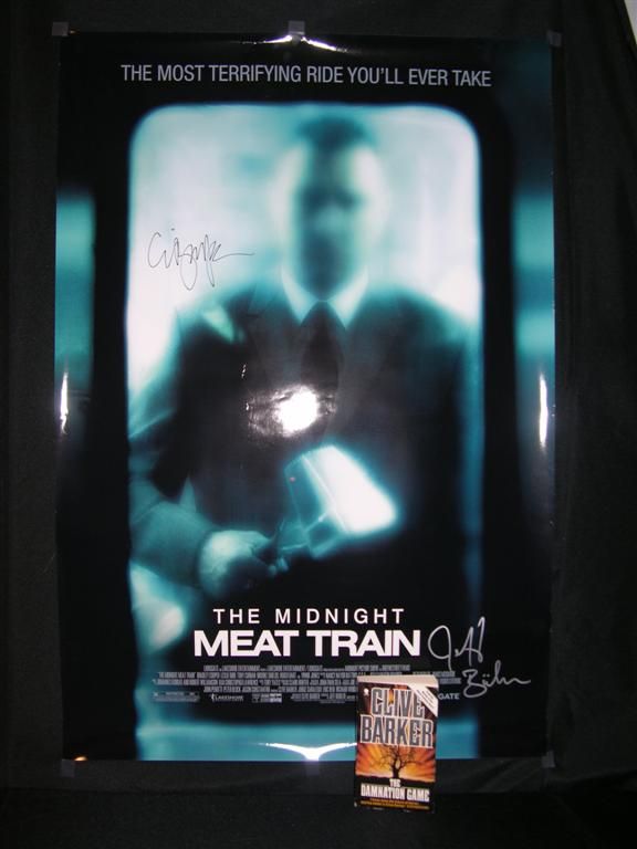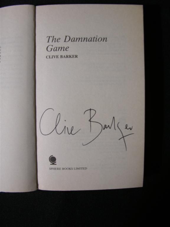 The Damnation Game paperback book, signed by author Clive Barker in black pen on the title page. This lot further includes a rolled poster for Barker's film Midnight Meat Train, signed by Barker and screenwriter Jeff Buhler. (40x27)