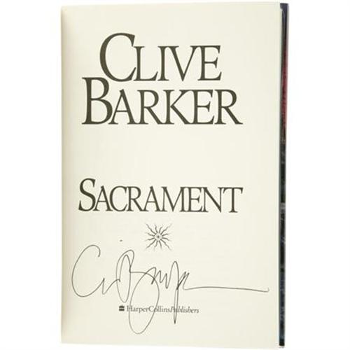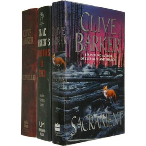 <B>Clive Barker: Three Signed First Editions</B></I> <B><I>Sacrament</B></I></B></I> (New York: Harper Collins, 1996), first edition, 447 pages, red-and-blue binding with silver lettering, 8vo (9.5" x6.25"), dust jacket (in protective cover). The title page is signed <I>"Clive Barker"</B></I>. The book and dust jacket are in as new condition.<BR><B><I>Shadows in Eden</B></I></B></I> (Lancaster, PA: Underwood-Miller, 1991), first edition, 465 pages, illustrations, black-cloth binding with gold lettering, 8vo (9.5" x 7.75"), dust jacket (in protective cover). The title page is signed <I>"Clive Barker"</B></I>. The book and dust jacket are in fine condition.<BR><B><I>Everville</B></I></B></I> (New York: Harper Collins, 1994), first edition, 697 pages, red-and-green binding with gold lettering, 8vo (9.5" x 6.25"), dust jacket (in protective cover). The title page is signed <I>"Clive Barker"</B></I>. The book is in fine condition with some minor scuffs and soiling; the dust jacket is fine.<BR><BR><b>Shipping:</b> Books & Catalogs (<a target="_blank" href="http://www.heritageauctions.com/common/shipping.php">view shipping information</a>)