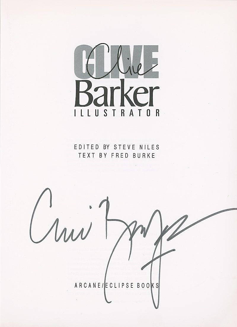 Signed book: Clive Barker: Illustrator. First trade paperback printing. Forestville, California: Eclipse Books, 1990. Softcover, 9 x 12, 124 pages. Signed on the title page in black felt tip. Some creasing to corners, otherwise fine condition.