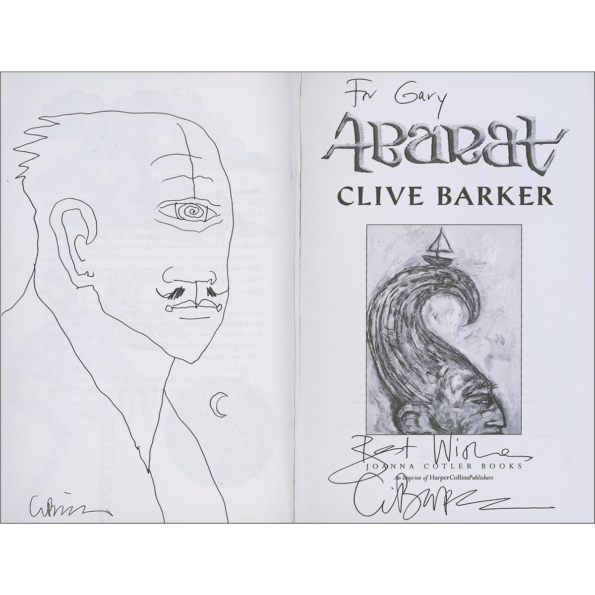 Signed book: Abarat. First edition, advance reading copy. New York: HarperCollins, 2002. Softcover, 6 x 9.25, 388 pages. Signed and inscribed in black felt tip on the title page, “For Gary, Best Wishes, Clive Barker.” On the opposite page, Barker has signed again and drawn a large sketch of a one-eye monster. In fine condition.
