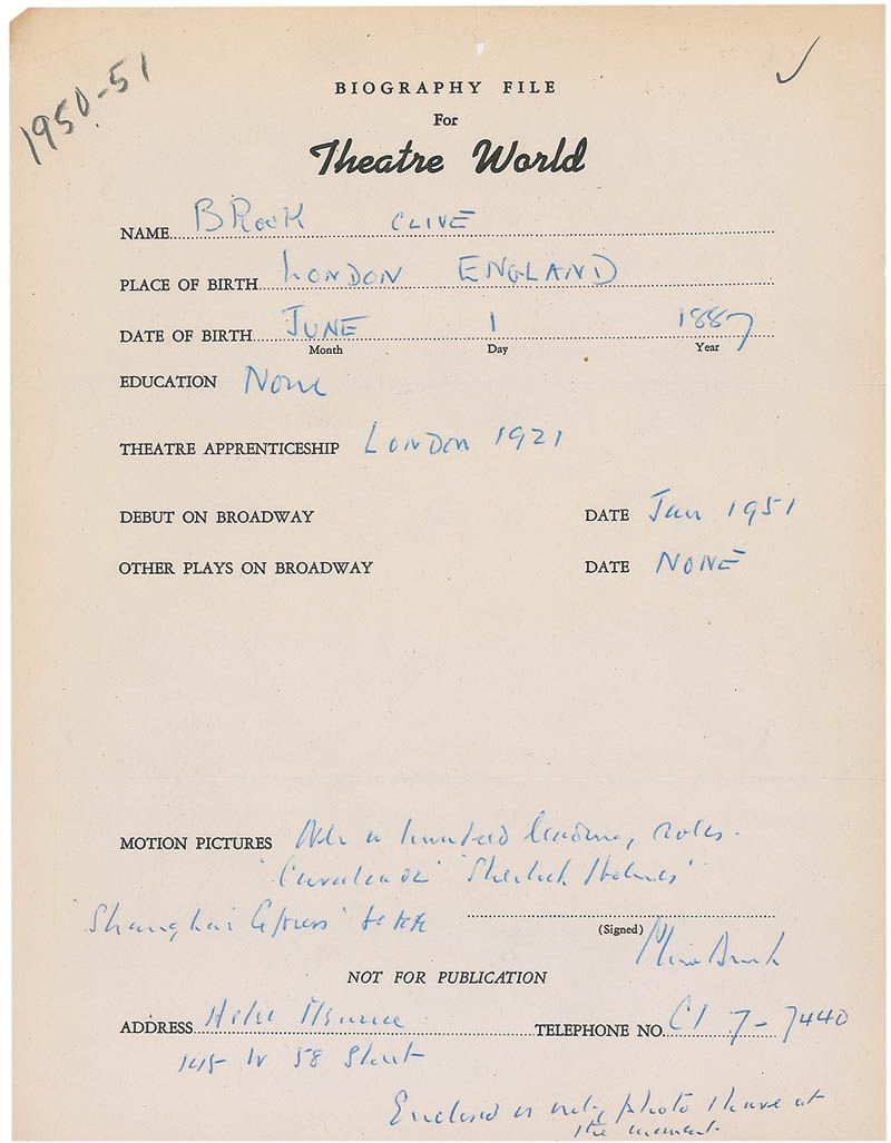 DS, one page, 8.5 x 11, 1950-51. Biography file for Theatre World magazine, filled out by Brook, including a signature in print at the top and list of film experience, signed at the conclusion, “Clive Brook.” Two horizontal storage folds, light toning to the borders, a couple small tears to the top and bottom edges, and a couple pencil notations and a tack hole to the top, otherwise fine condition.