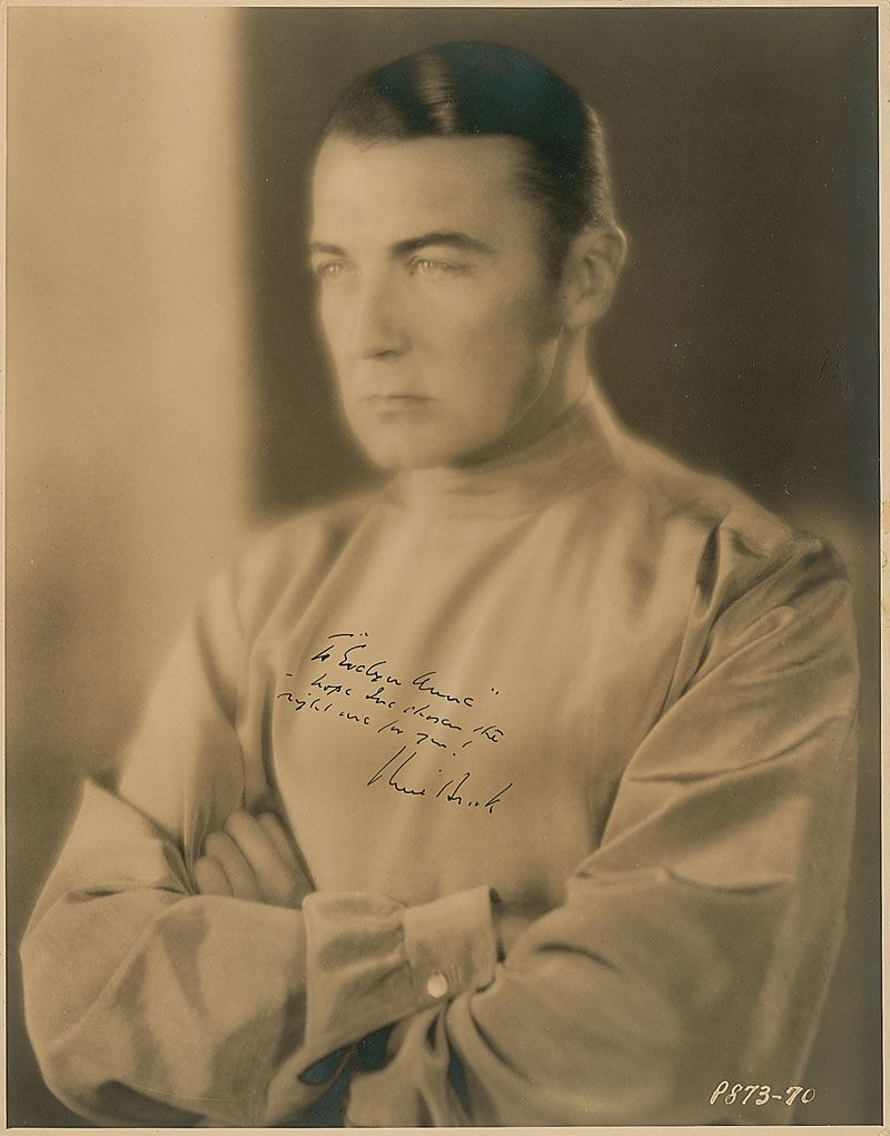 British actor (1887–1974) who played opposite Marlene Dietrich in Shanghai Express. He also played Sherlock Holmes three times. Handsome vintage matte-finish sepia 11 x 14 photo, signed and inscribed in fountain pen, “To ‘Evelyn’s Aunt,’ Hope I’ve chosen the right one for you! Clive Brook.” Very subtle rippling to top edge, a very faint marginal spot, and a hint of silvering to the darker areas, otherwise fine, fresh condition.