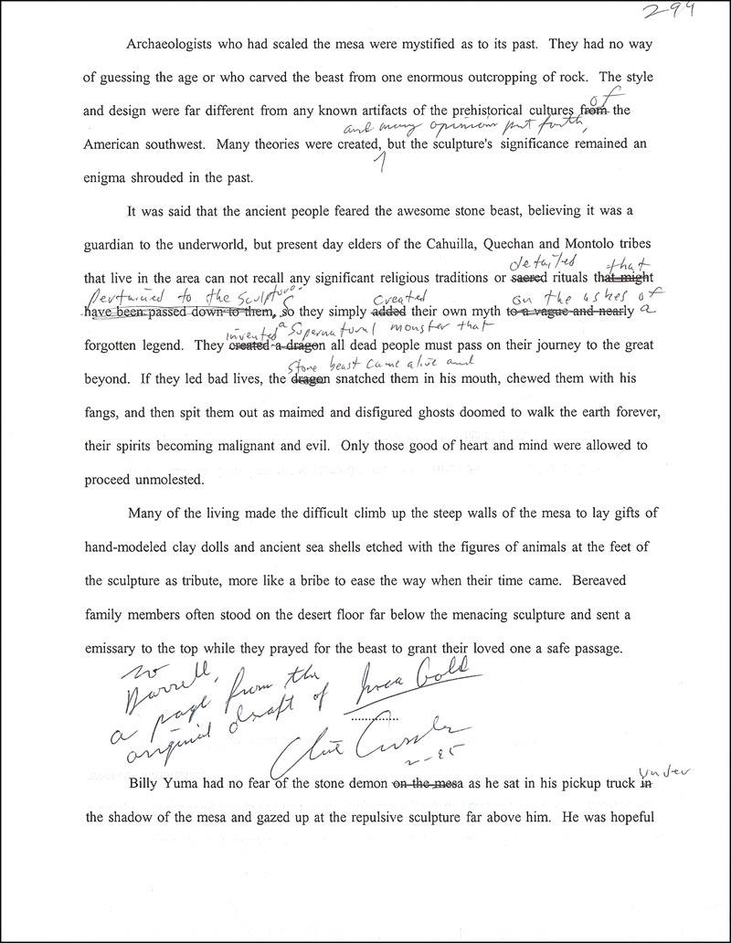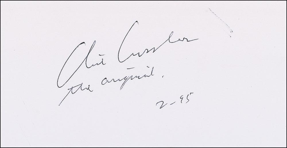 Two annotated and signed typed manuscript draft pages from Inca Gold, with corrections in Cussler’s hand, each signed and inscribed to a different recipient by Cussler, and a ballpoint signature, “Clive Cussler, the original 2-95,” on an off-white 5.5 x 3 card. In fine condition, with intersecting folds to one page, and a couple stray ink marks to signed card.
