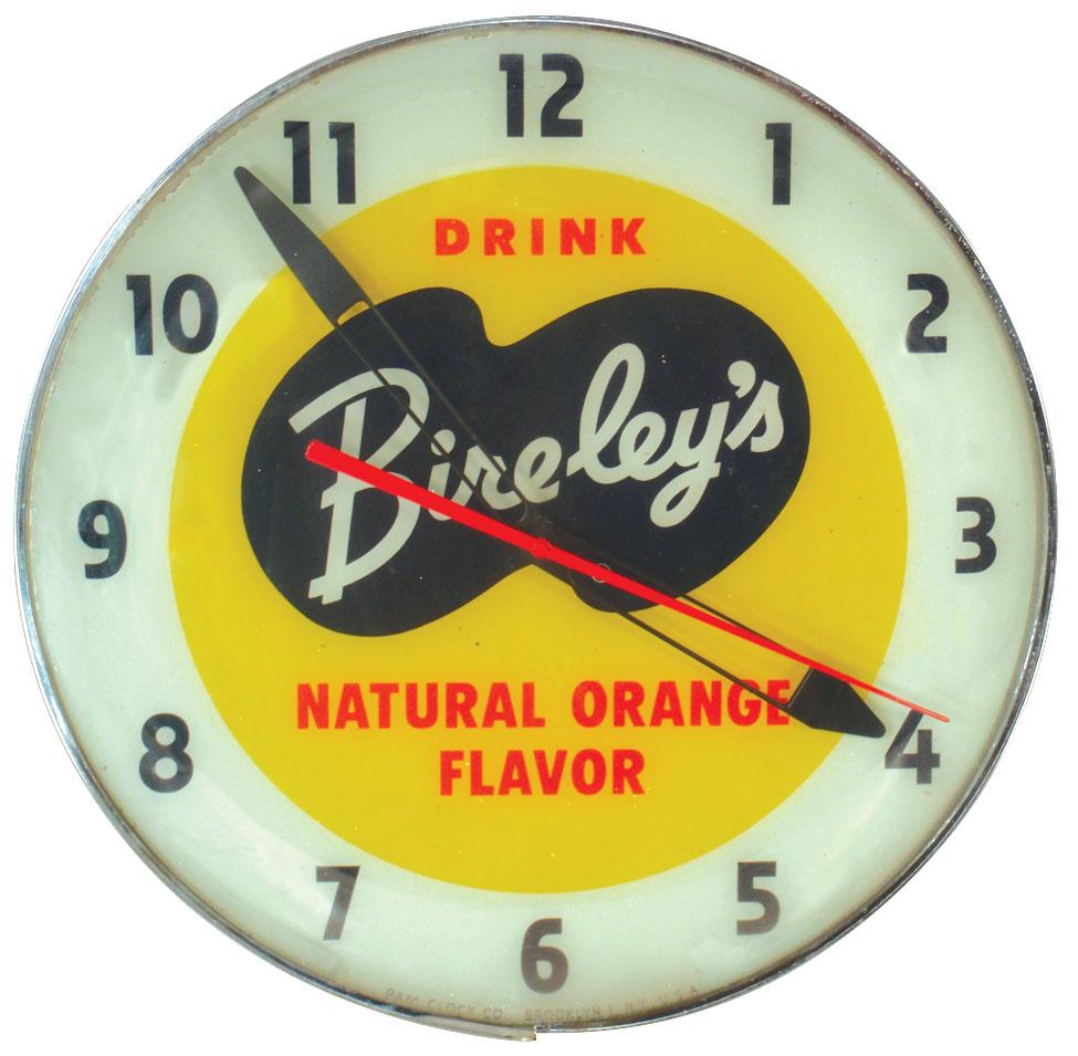 Clock, Bireley's Orange Soda, Pam light up w/metal case & curved outer glass, VG working cond, 15"Dia.