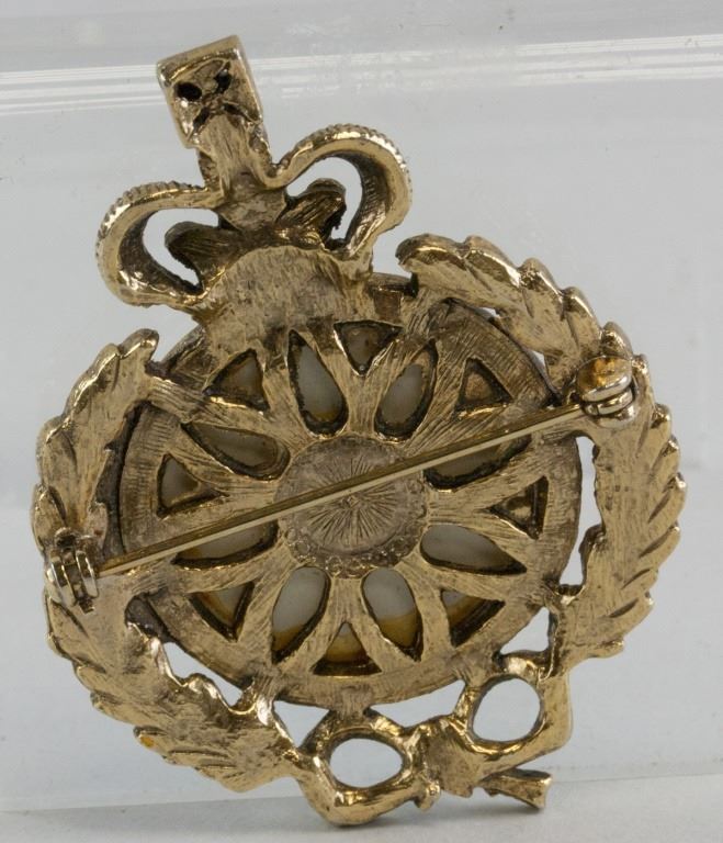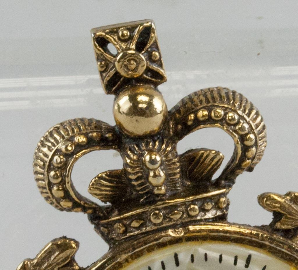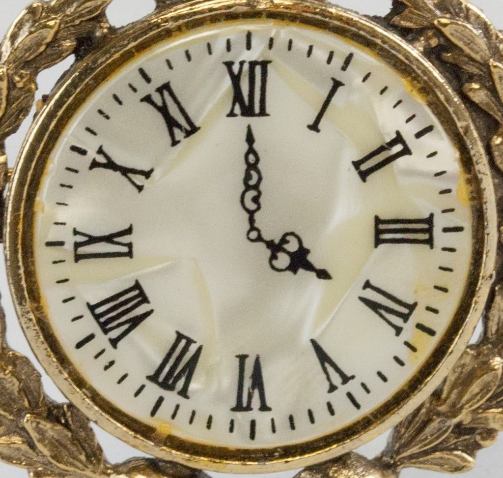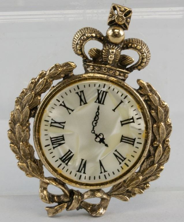 Brooch, in the shape of a pocket watch. With laurel wreath surrounding it. With crown on top. 5.3 x 4 cm, 20 grams.