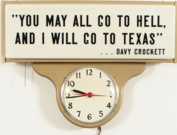 Originally a 1950's Lone Star lighted clock sign with replaced top, quote from Davy Crockett: "You May All Go To Hell, And I Will Go To Texas", hand painted. Working condition, measures 25 1/2" wide x 19 1/2" tall.