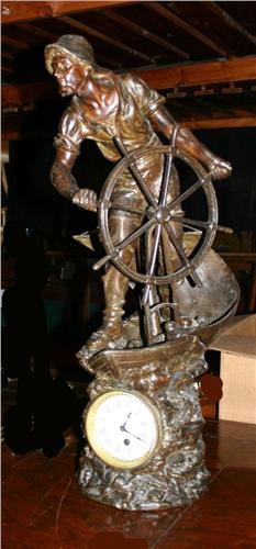 Fisherman at wheel of boat with clock in base. Approximately 26" tall with 8" diameter base.