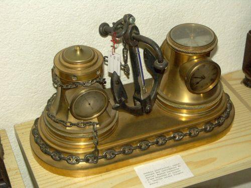 Pendule (L'industrie) en bronze doré et patiné, représentant les instruments de marine. La montre est surmontée d'une boussole signée L. CASELLA LONDON VINGERS PATOUT, époque 1900