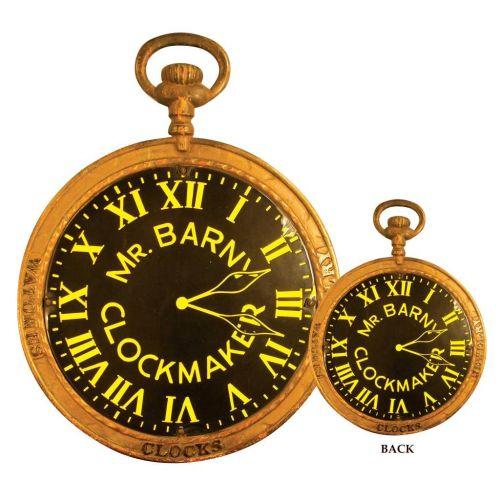 Mr. Barney Clock Makers Trade Symbol in cast iron case, Rare porcelain faces on both sides. One side has a chip at 2:00 the other side is near mint. 20 X 26 inches.