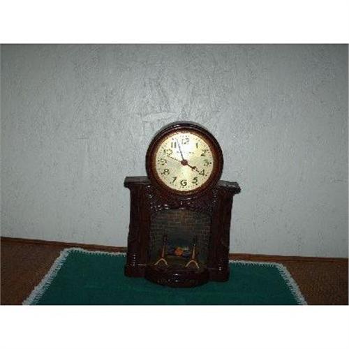 Clock is a 1955 Master Crafters Fire Place Motion Clock. The clock was made in the USA by Clock and Radio Company Chicago, Ill. The clock works and is in very good condition. When you plug the clock in, the fire place logs turn and it looks like a real fire place. This is a very unique clock. The clock measures 10.5 tall and 9 inches wide.The rail on the front is missing it doesn'ttake away the look.