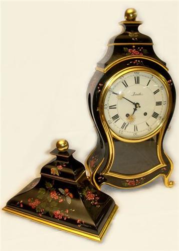 Pendule neuchâteloise ZENITH en bois laqué noir à décor floral, cadran émail, aiguilles soleil, sonnerie heures et demies sur 2 cloches, env. 1960, hauteur 70 cm, en très bon état