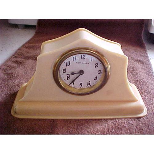 Clock, New Haven, Conn., celluloid,6.75 X 2.50 X 3.75 tall; As found in a home in Bennington, vt. Keeps on ticking.