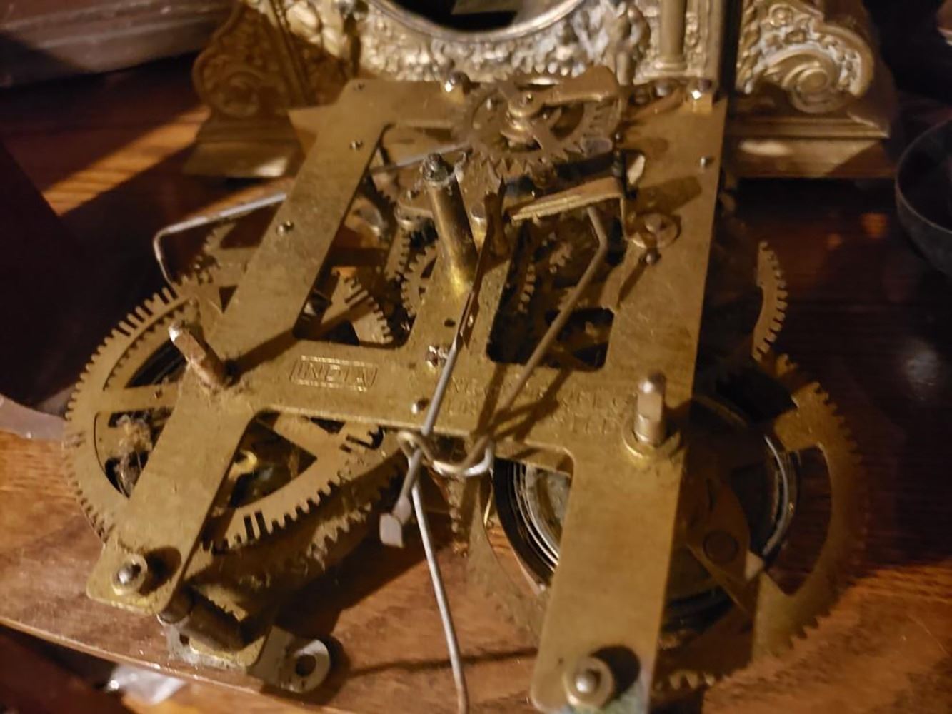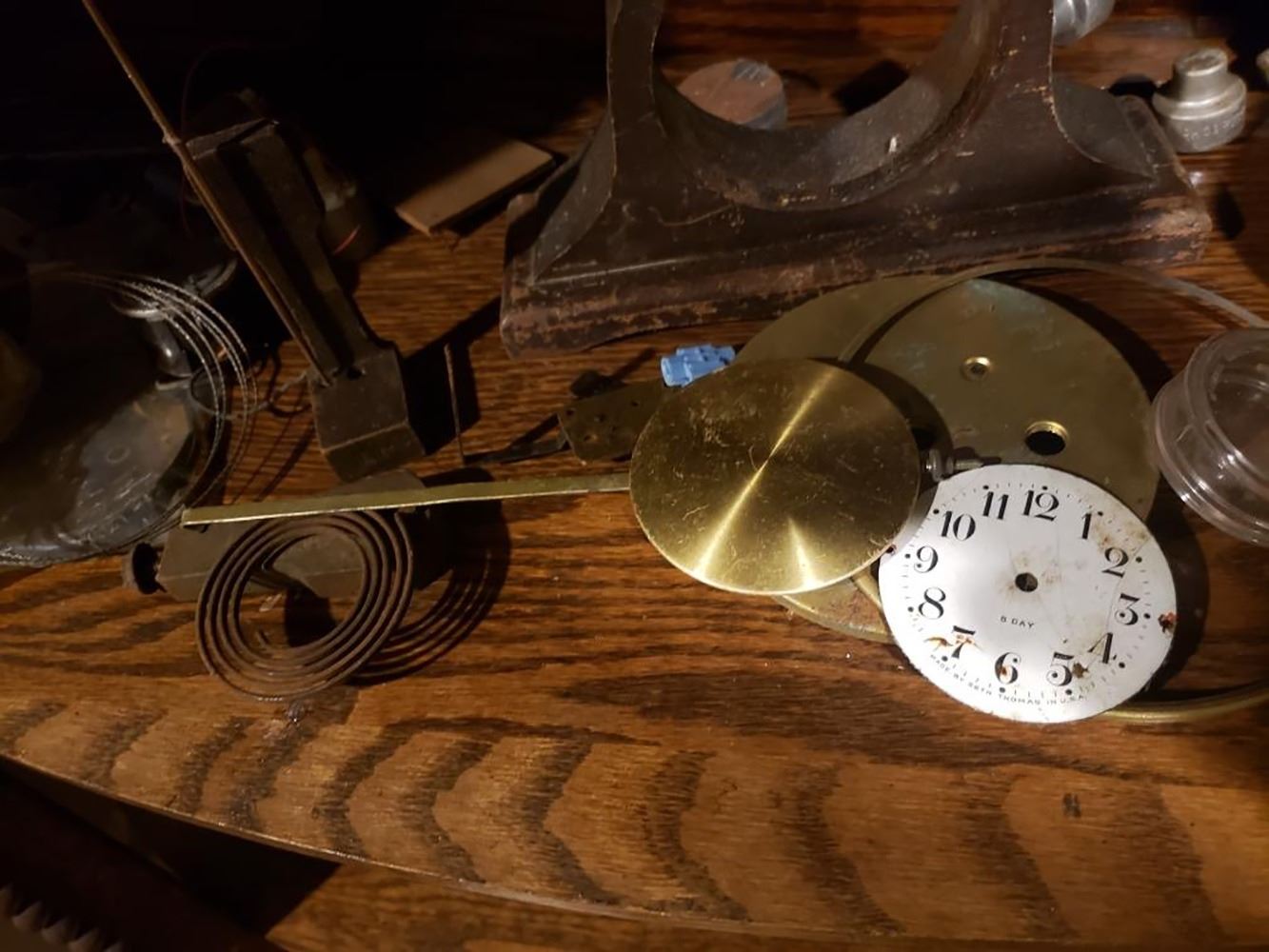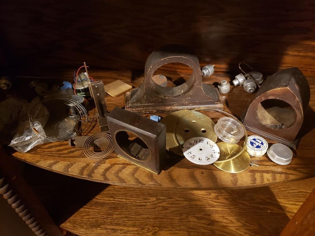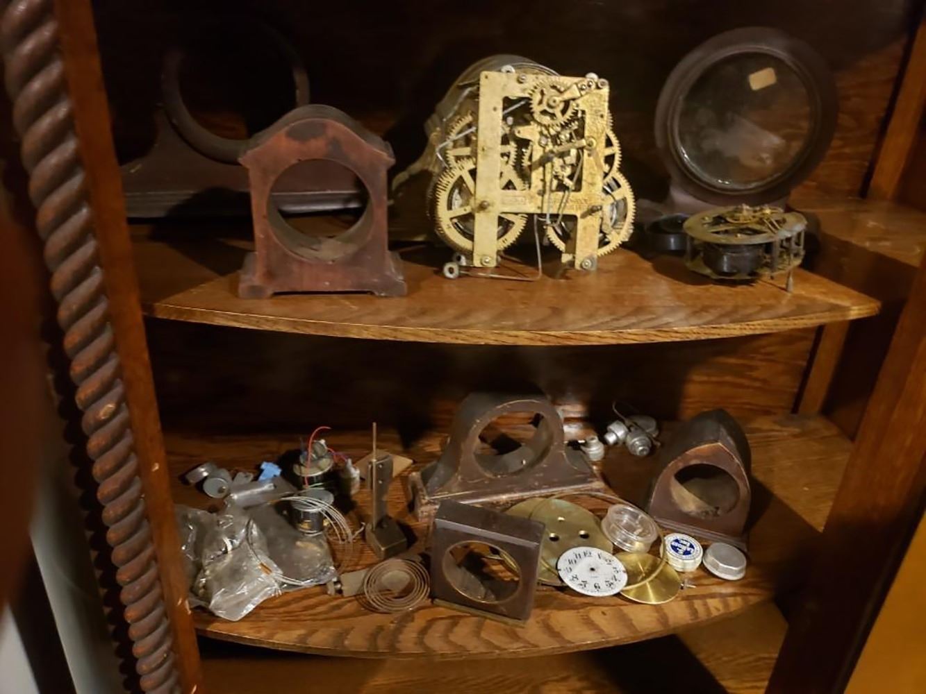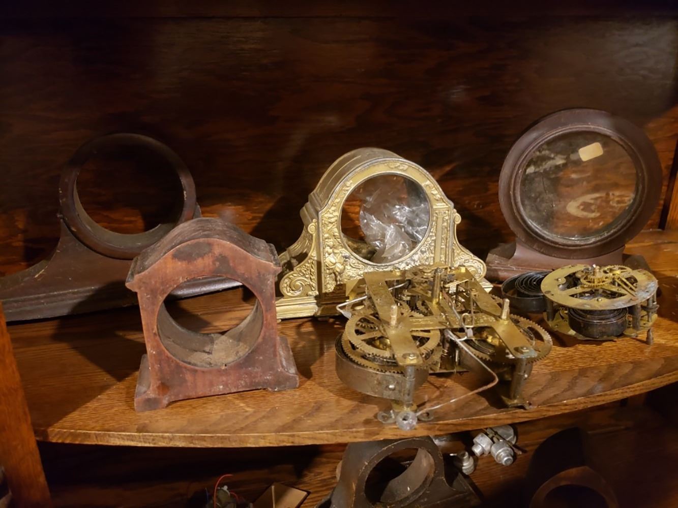 2 shelfs of clock parts, movements, and cases of collectible clocks.