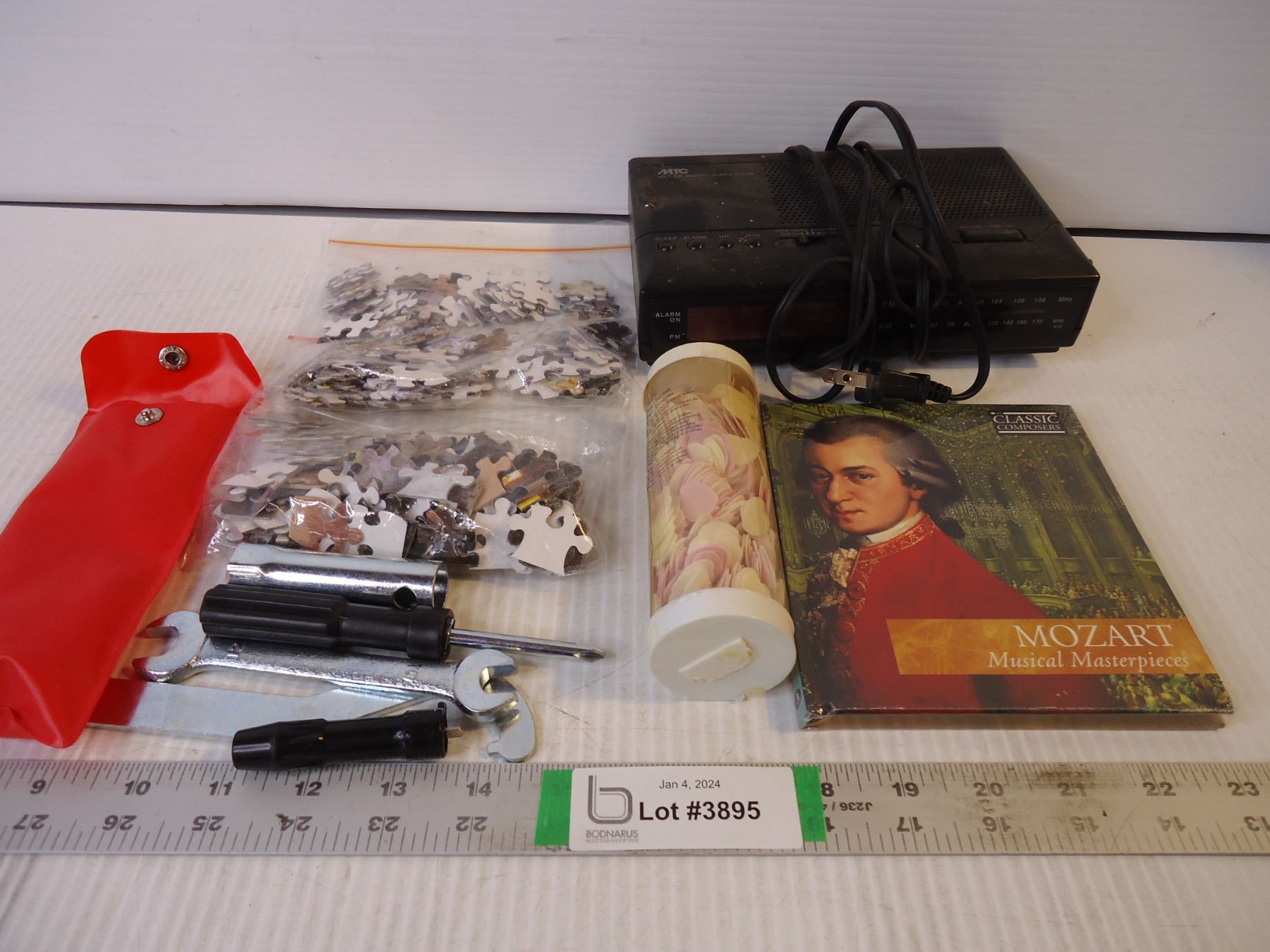 Clock Radio(works),Mozart DVD (sealed),Soap Confetti (2) small puzzles and small tool kit