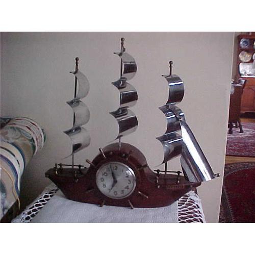 Clock, Sessions, 8 Day, Wooden ship, Metal sails (Savannah), just cleaned, regulated, etc. wind in back; Pat. 115-413