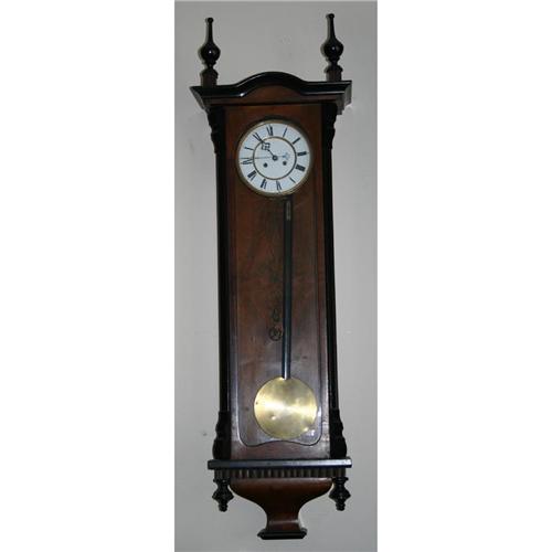 Two weight Wall Clock - with Victorian Styling  - Tall, narrow, and streamline in appearance. Porcelain dial with Roman Numerals and minute ticks on outer ring. Walnut with black accents.  Case measures approximately 12" x 40" plus the finials.