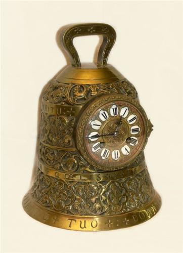 Jolie pendule à poser en bronze en forme de cloche, cadran en bronze à cartouches émail, chiffres romains, mouvement 8 jours, sonnerie heures et demies sur gong, env. 1890
