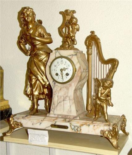 Pendule en marbre rose avec sujet en bronze doré représentant une musicienne, une harpe et des angelots, signée MIGNON par Rancoulet, sonnerie heures et demies sur cloche, époque 1880