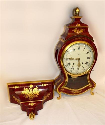 Pendulette neuchâteloise signée sur le cadran AZURA, cabinet en bois, couleur bordeaux avec dorures florales, env. 1940