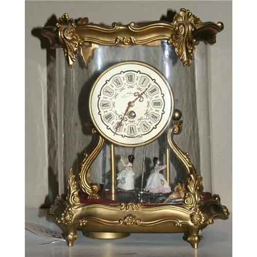 Clock under Glass Dome. Two dolls revolve as pendulum moves. Decorative dial with Roman Numerals. Measures approximately 8" x 9" x 11" H.