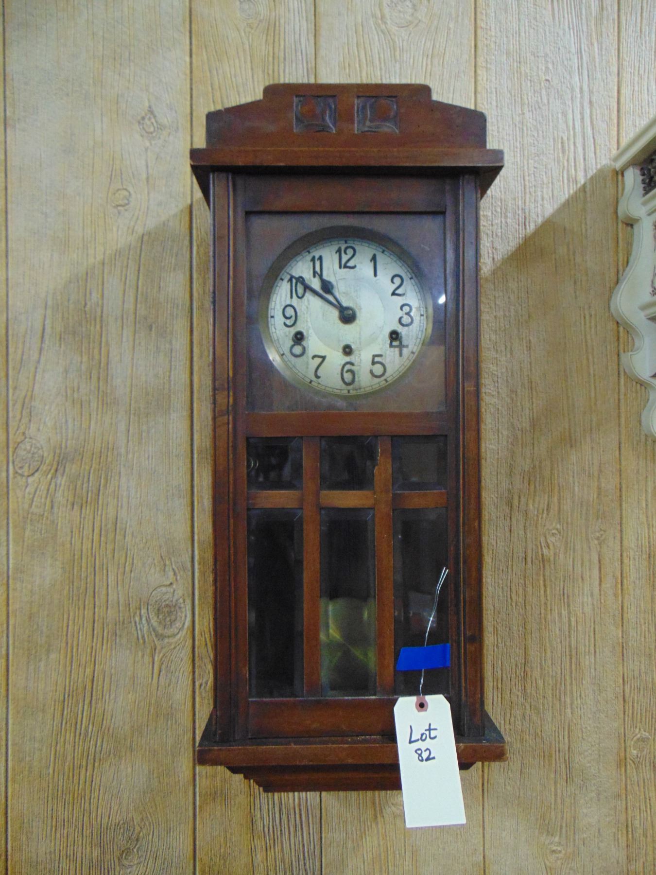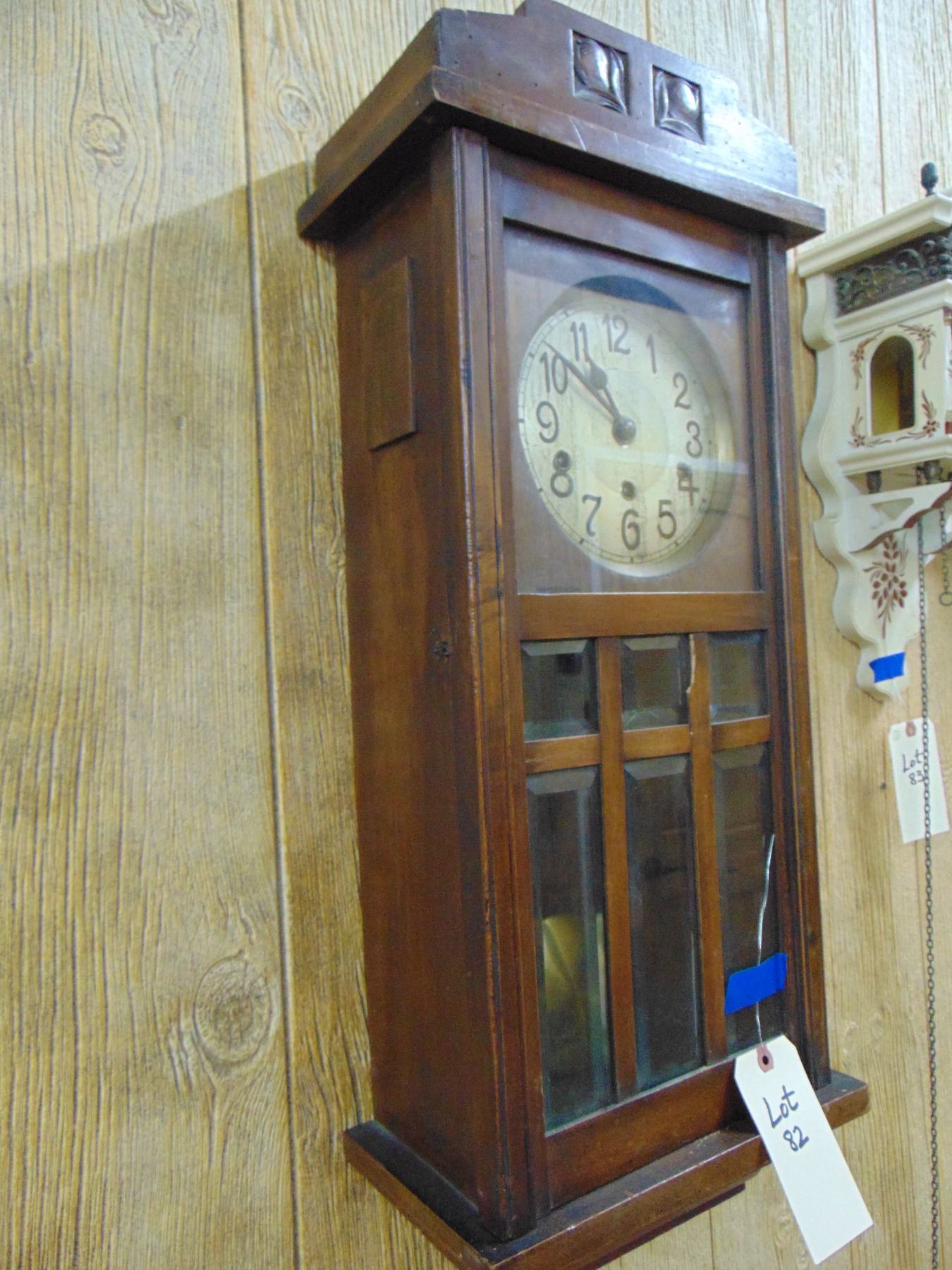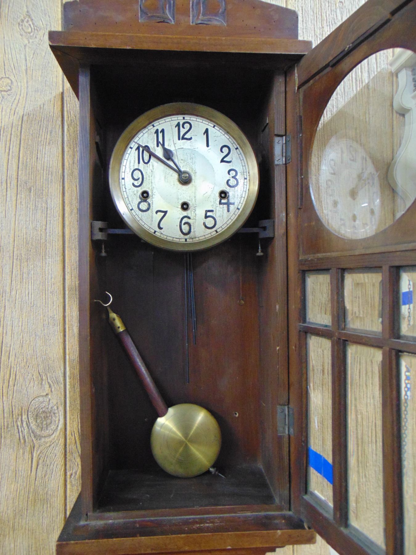 Wall mount time and strike pendulum clock; approximately 36"; includes pendulum; no key