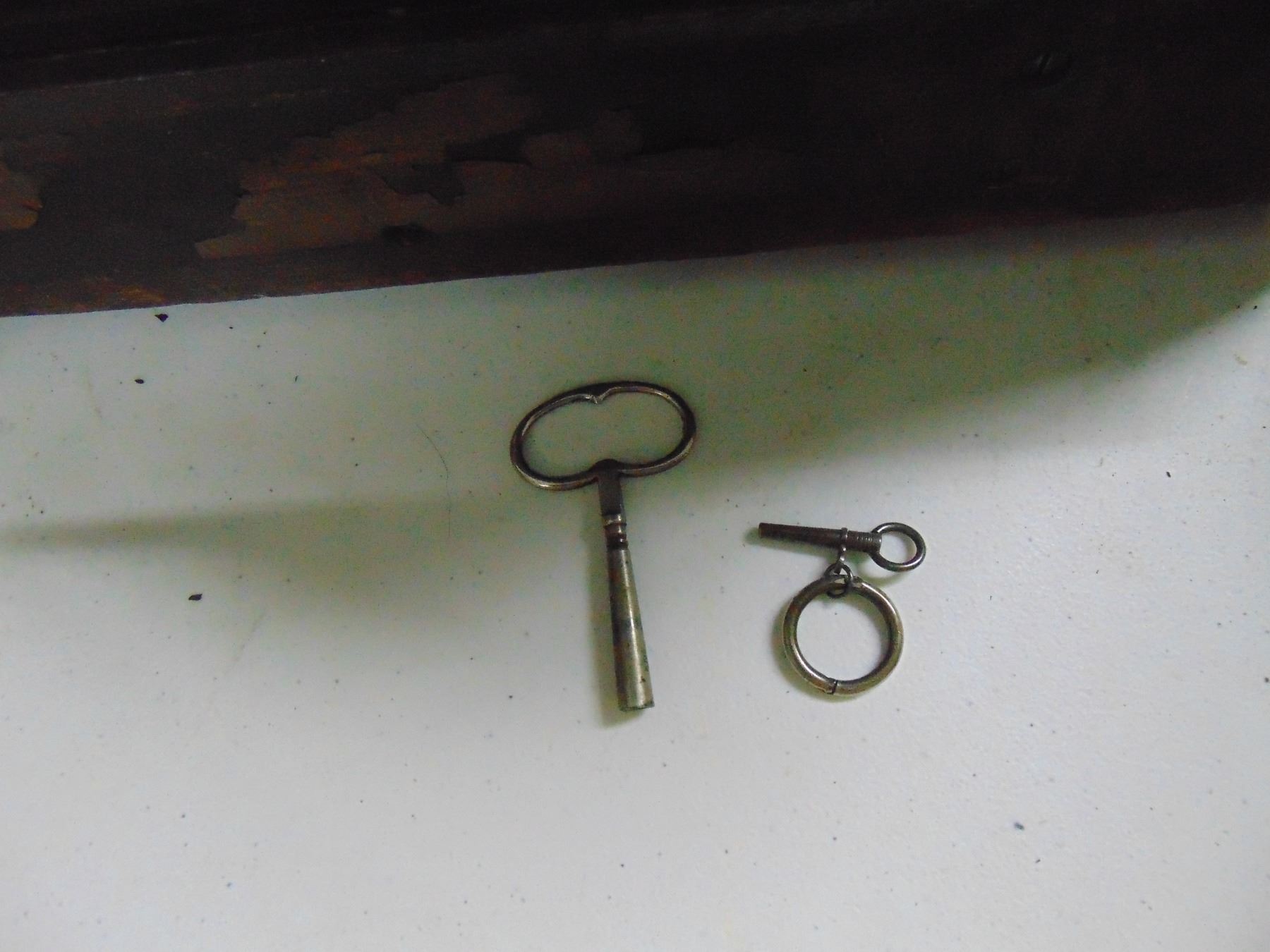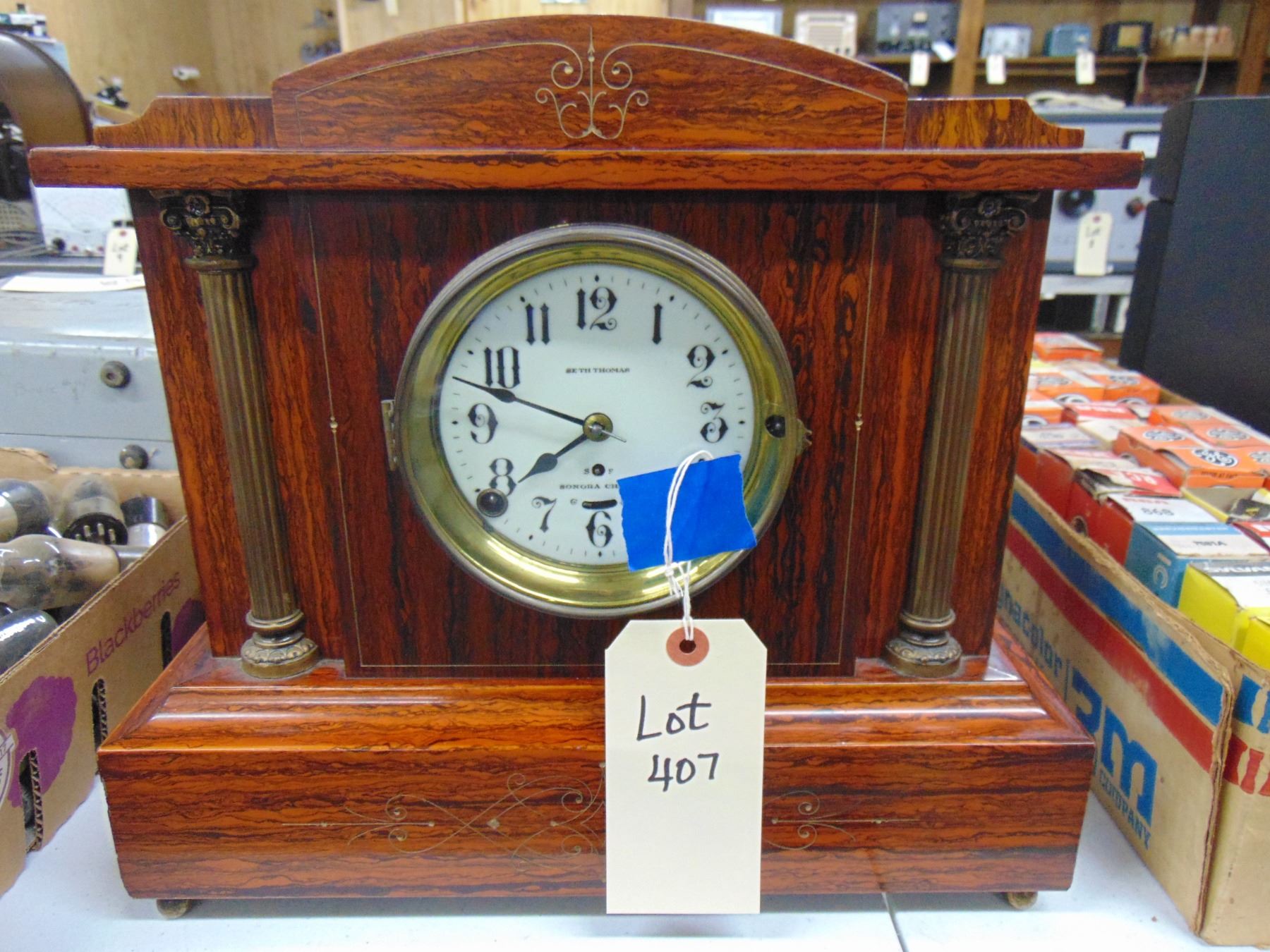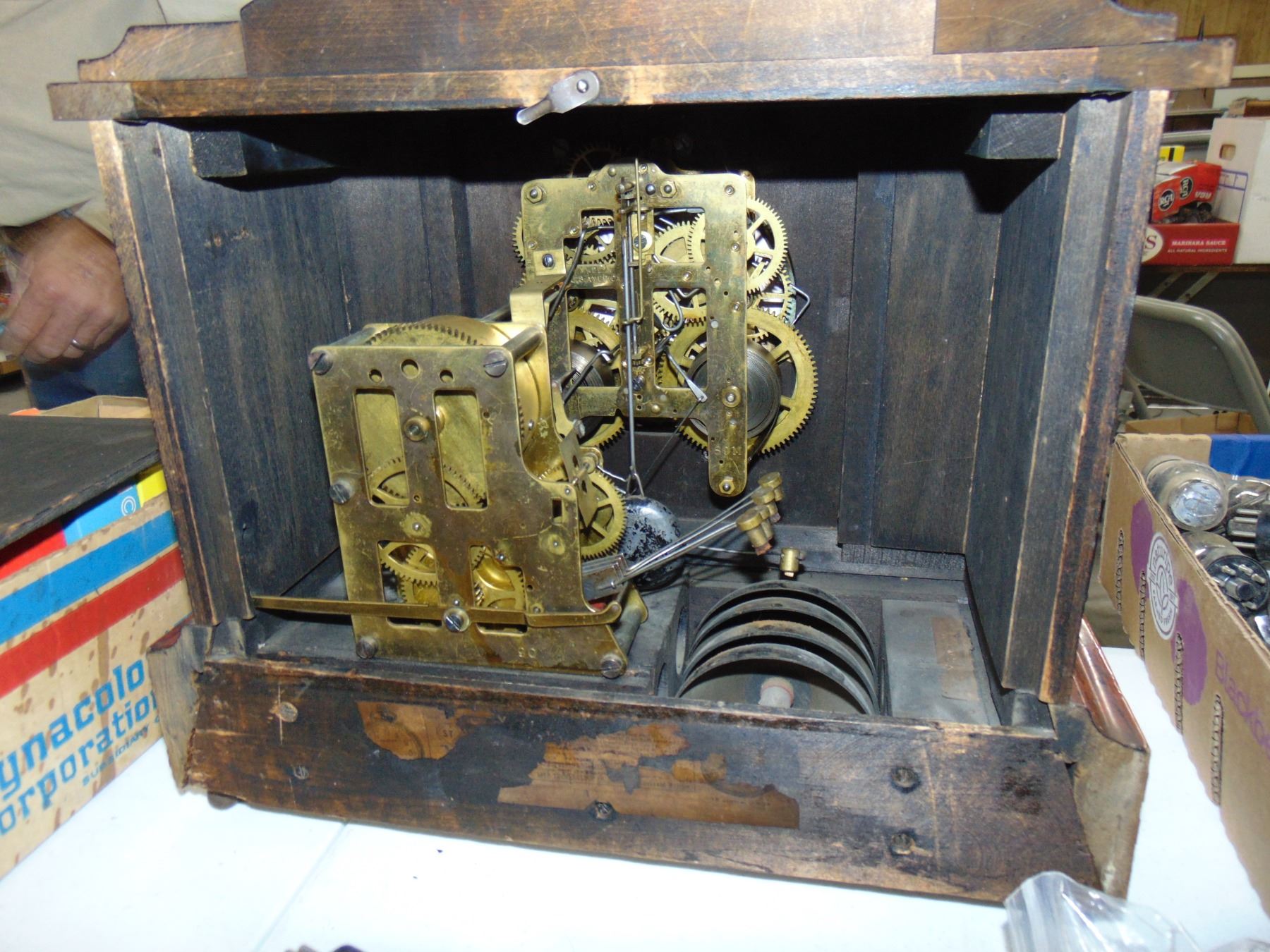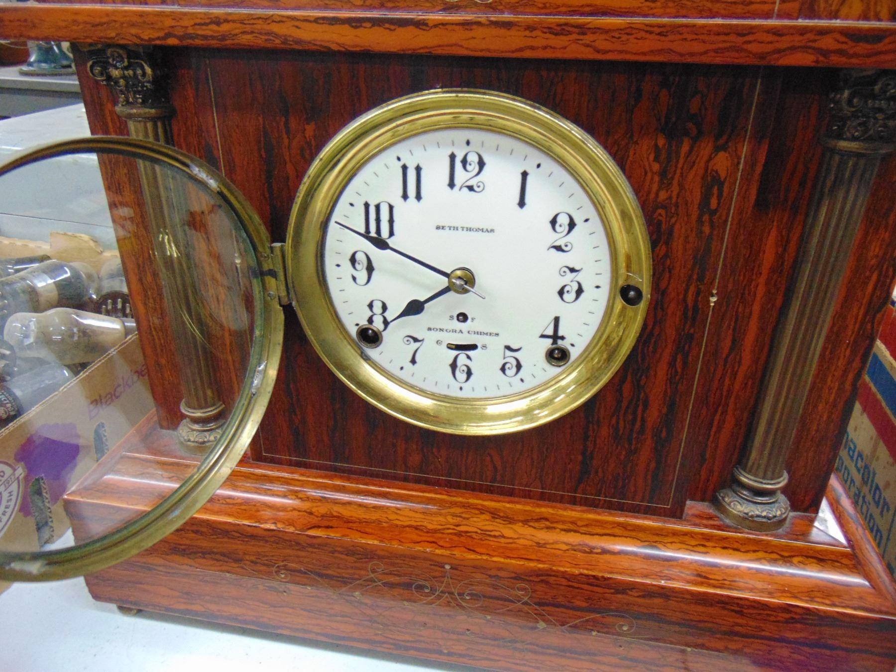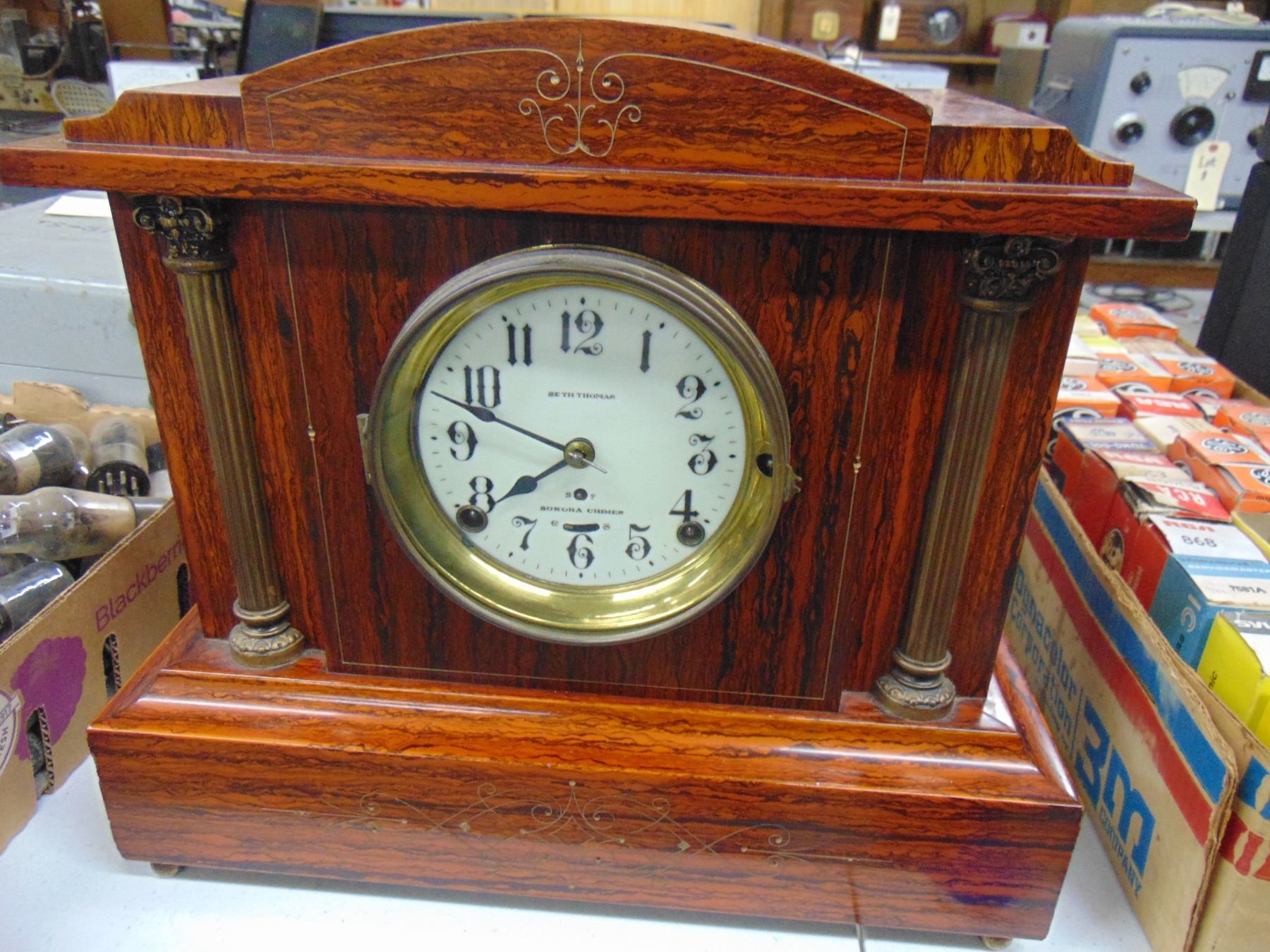 Early Seth Thomas mantle clock with Sonora chimes. Circa 1913. Dark red case. Pendulum with two keys for winding and time adjustment included; works