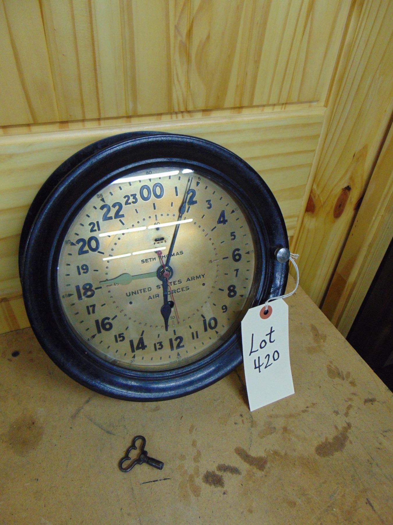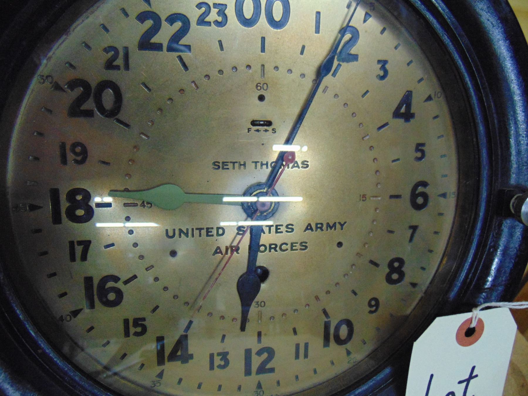 Seth Thomas Army Air Force wall clock with jeweled movement, circa 1942. Brass shortage at the start of World War ll resulted in the use of black bakelite for the case. Key included; works