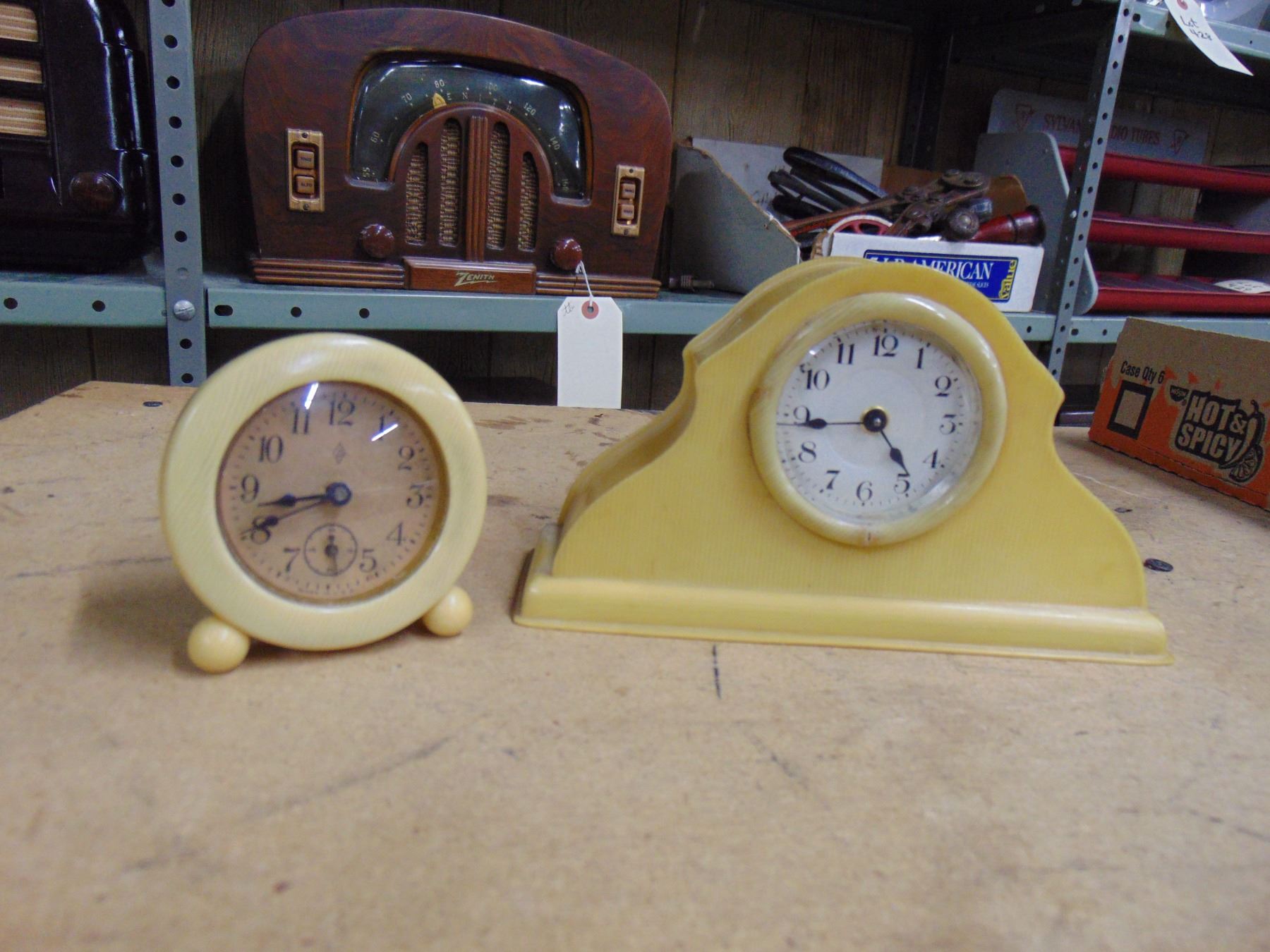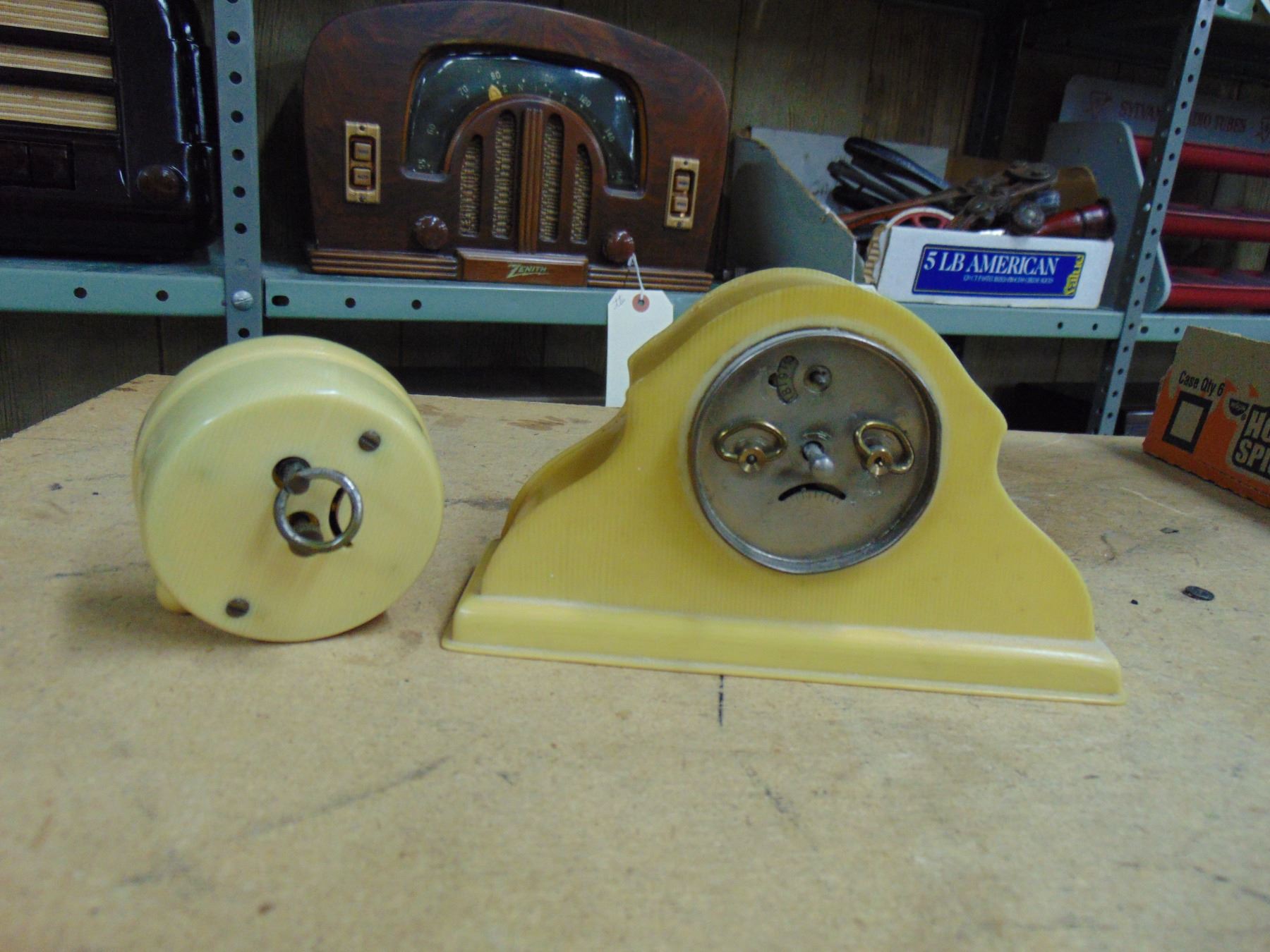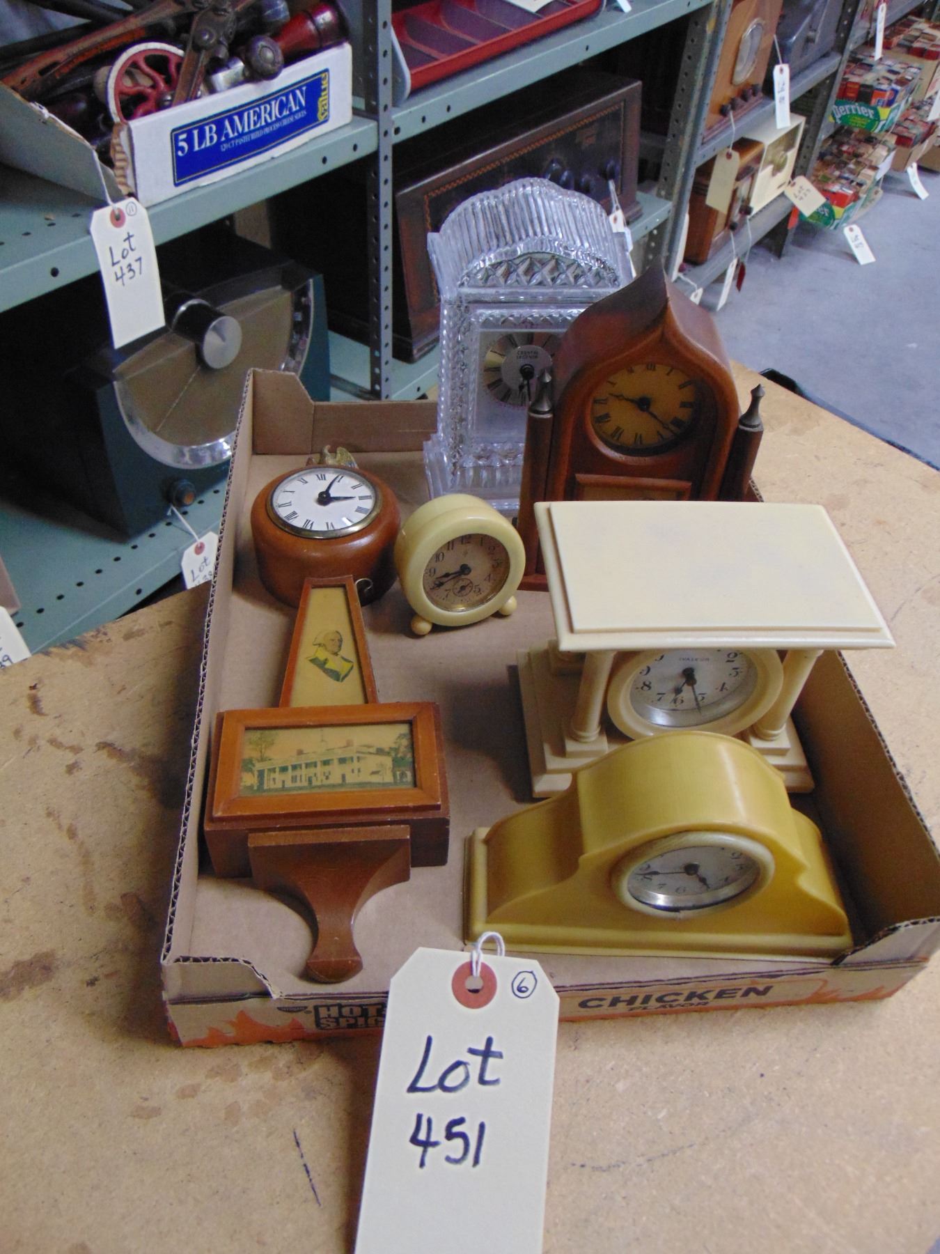 Flat of 6 miniature clocks; 3 bakelite, 2 wood, and 1 crystal
