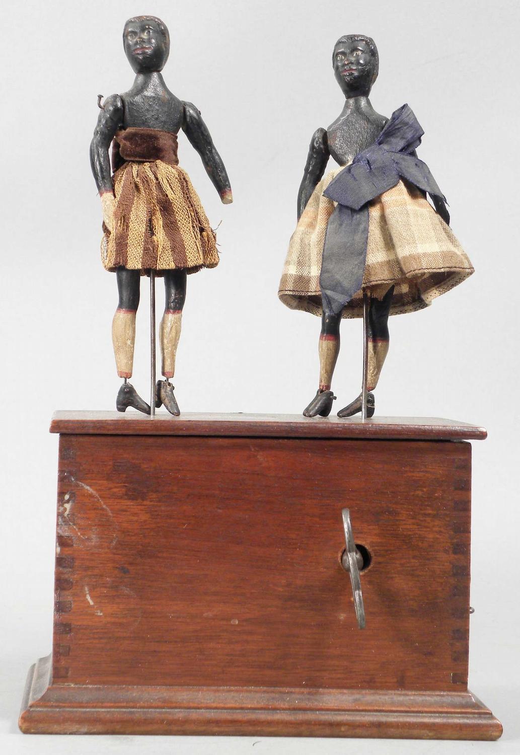Clockwork Black Americana Dancers. Original decal on walnut base. Some tattered clothing and missing hats otherwise good working condition, comes with key.