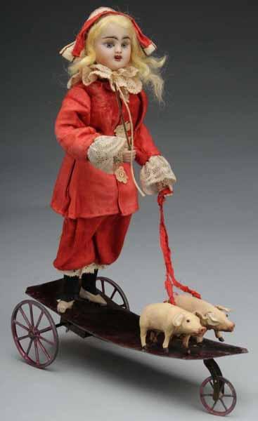 Description Boy with bisque head, glass inset eyes, open mouth and mohair wig herds two leather-covered pigs. His right foot moves in walking motion and hand raises and lowers the whip. Probably redressed, but appropriate old fabrics. Condition (Very Good). Size 9 - 1/2" x 13".