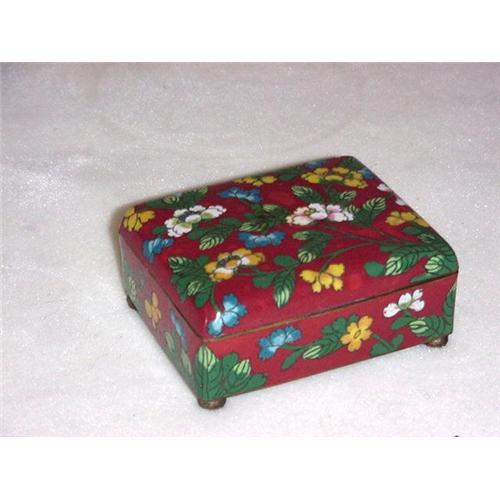 Cloisonné Box 3 3/4" long x 3" wide 1 1/3" high. Red background with an overall Oriental floral design.