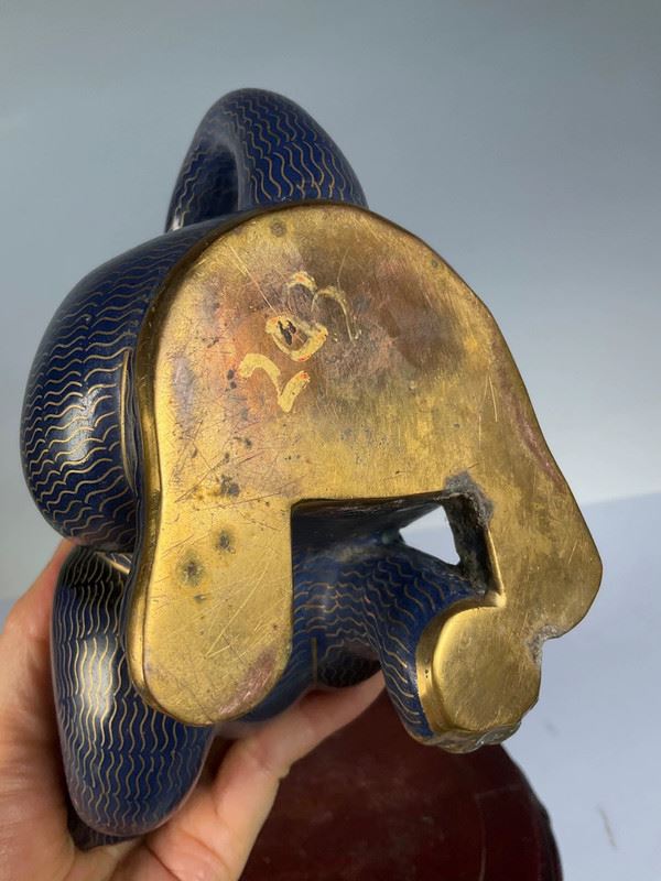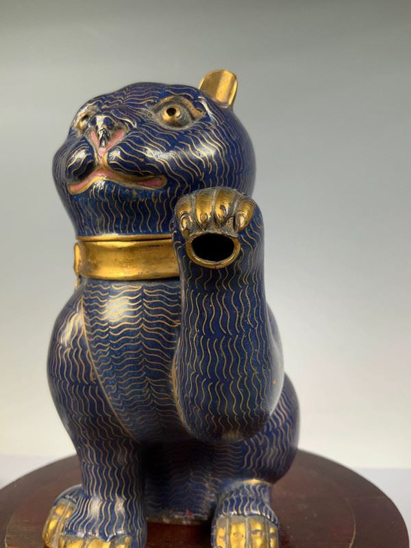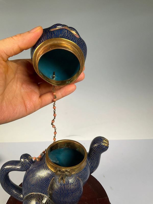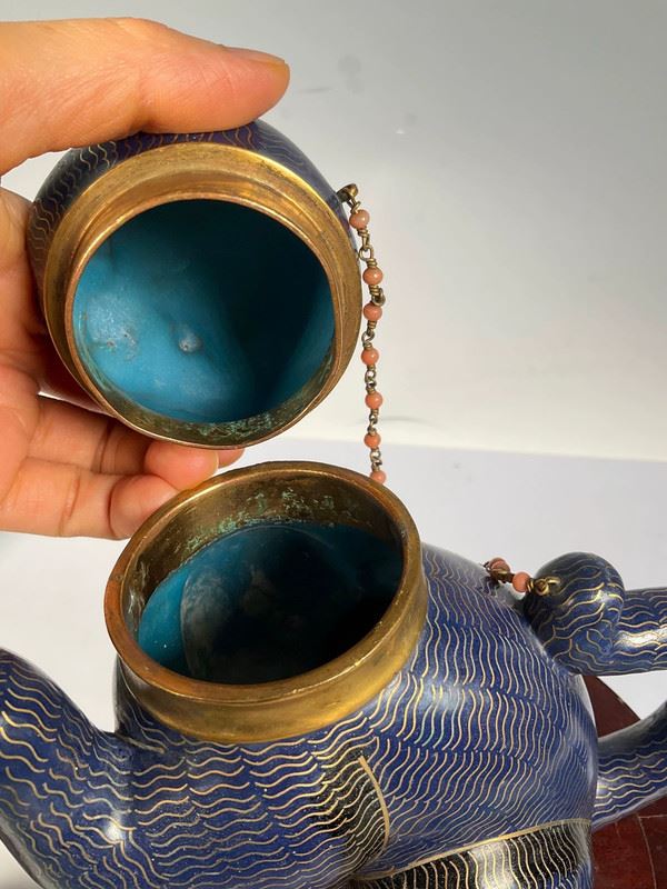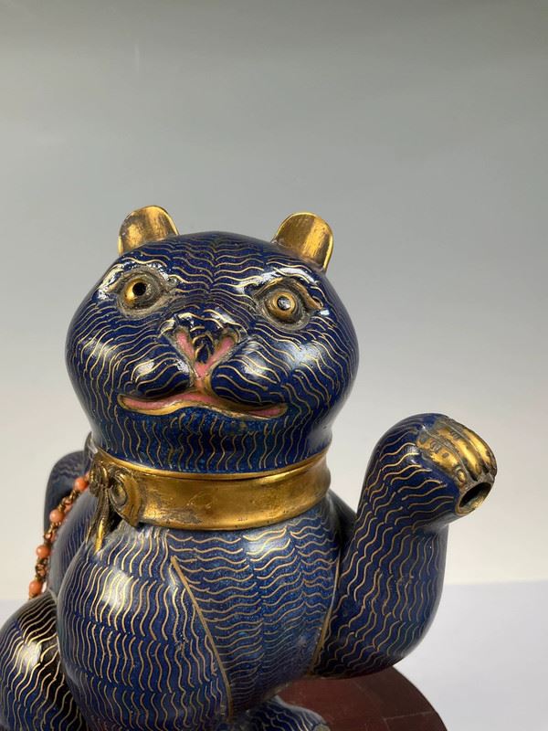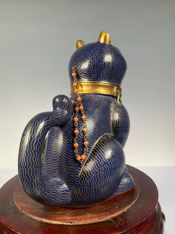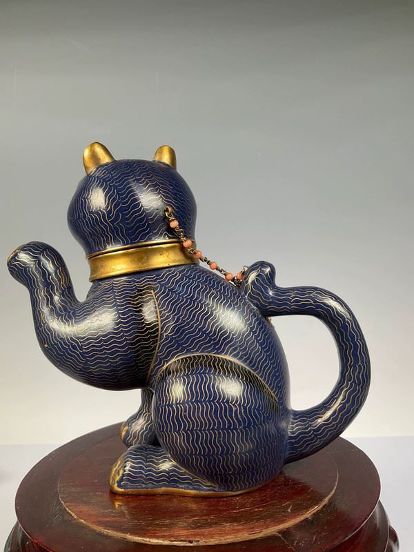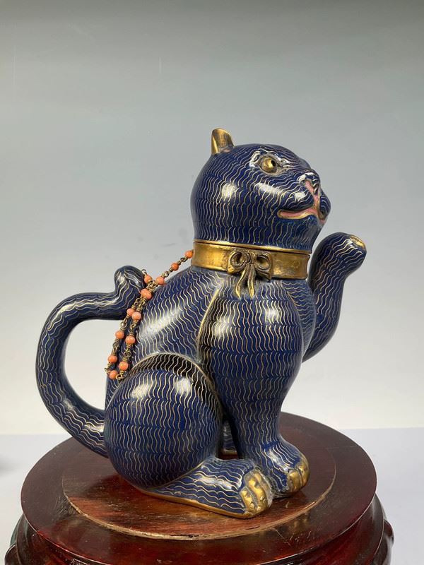 This cloisonné teapot is designed in the shape of a cat, with intricate craftsmanship and a classic blue enamel base adorned with golden accents. The cat’s ears, tail, and expressive face bring the design to life, making it both functional and highly decorative. The piece blends tradition and innovation, showcasing the exquisite cloisonné technique.