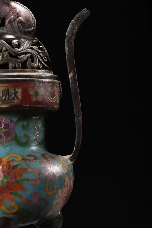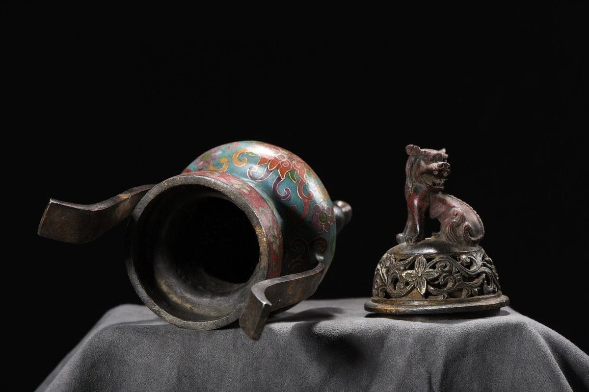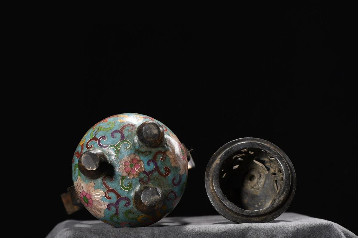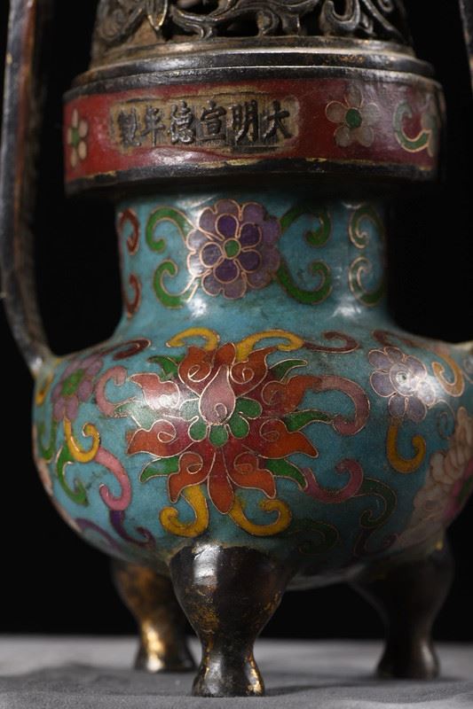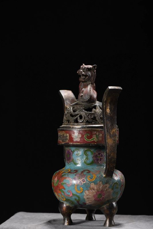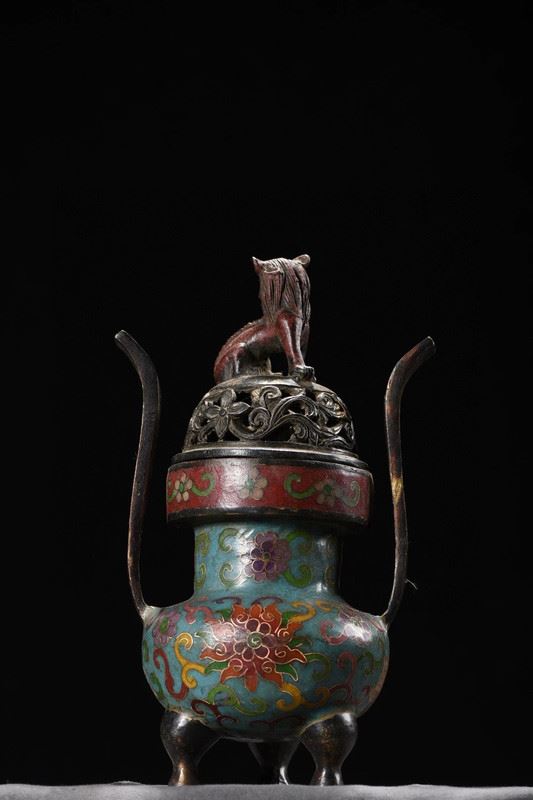 This cloisonné censer features a blue ground richly decorated with scrolling floral motifs in vivid, layered colors. The elongated upward-curving handles add elegance and vitality to the form. The pierced cover is topped with a finely cast beast finial, lively and symbolic of protection and auspiciousness. Supported by three sturdy legs, the censer stands with dignity and balance. Embodying both exquisite craftsmanship and auspicious symbolism, this censer is a refined piece ideal for display and collection.