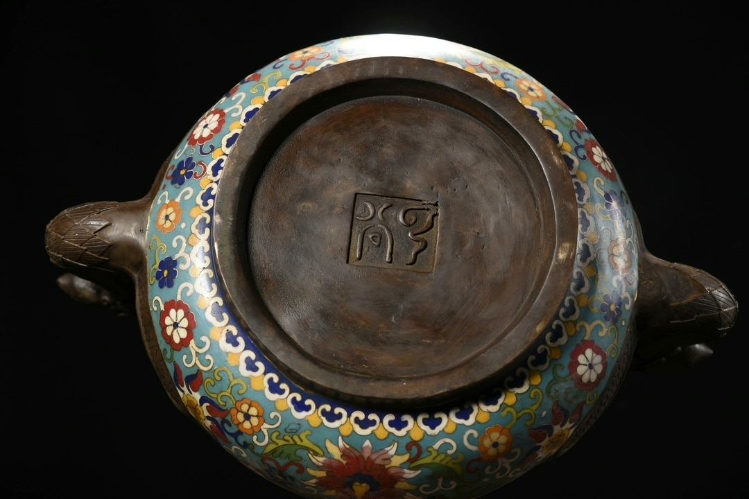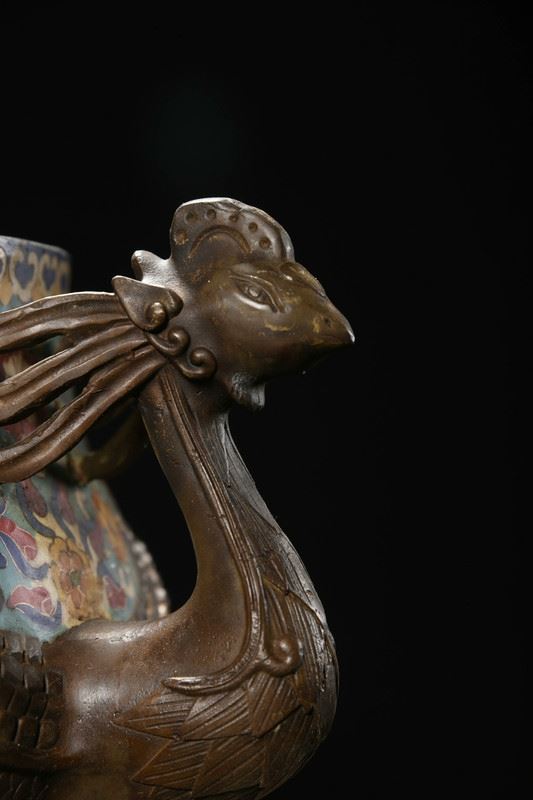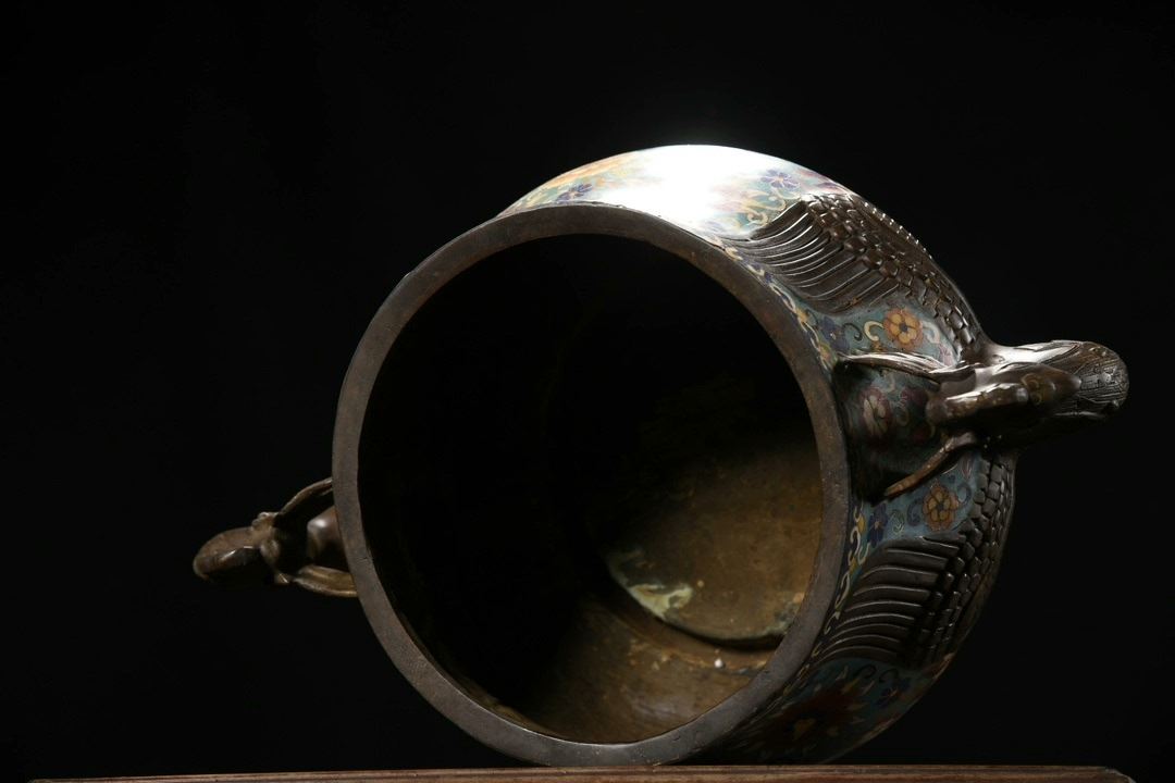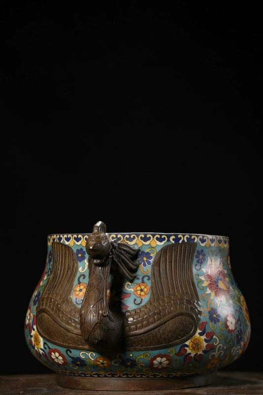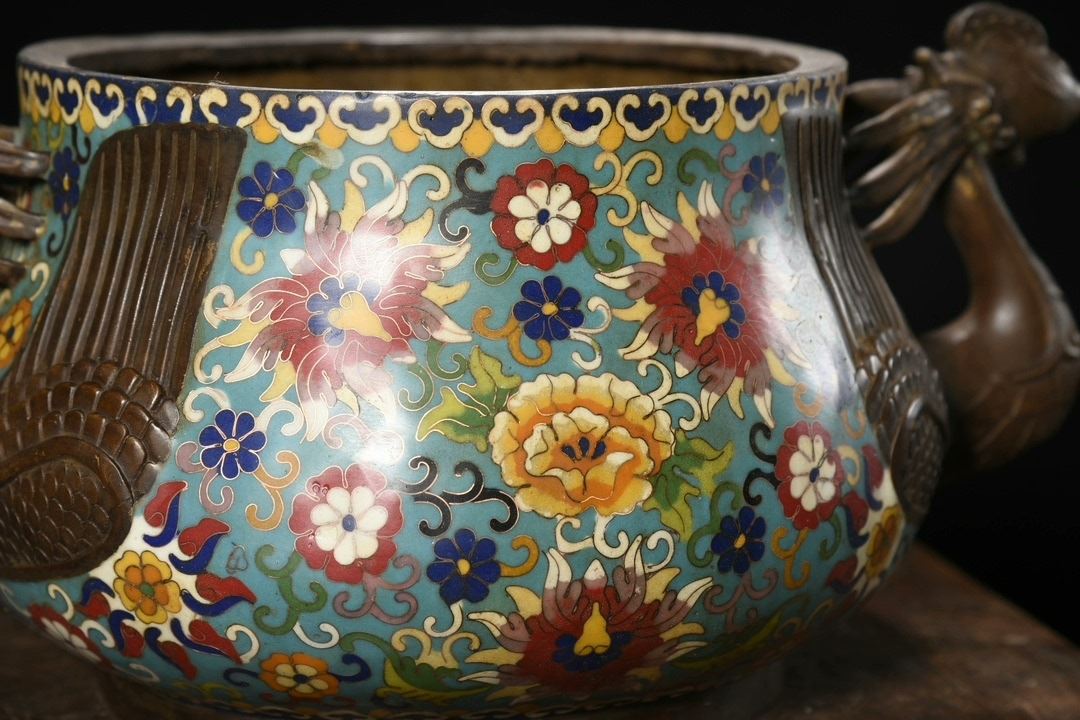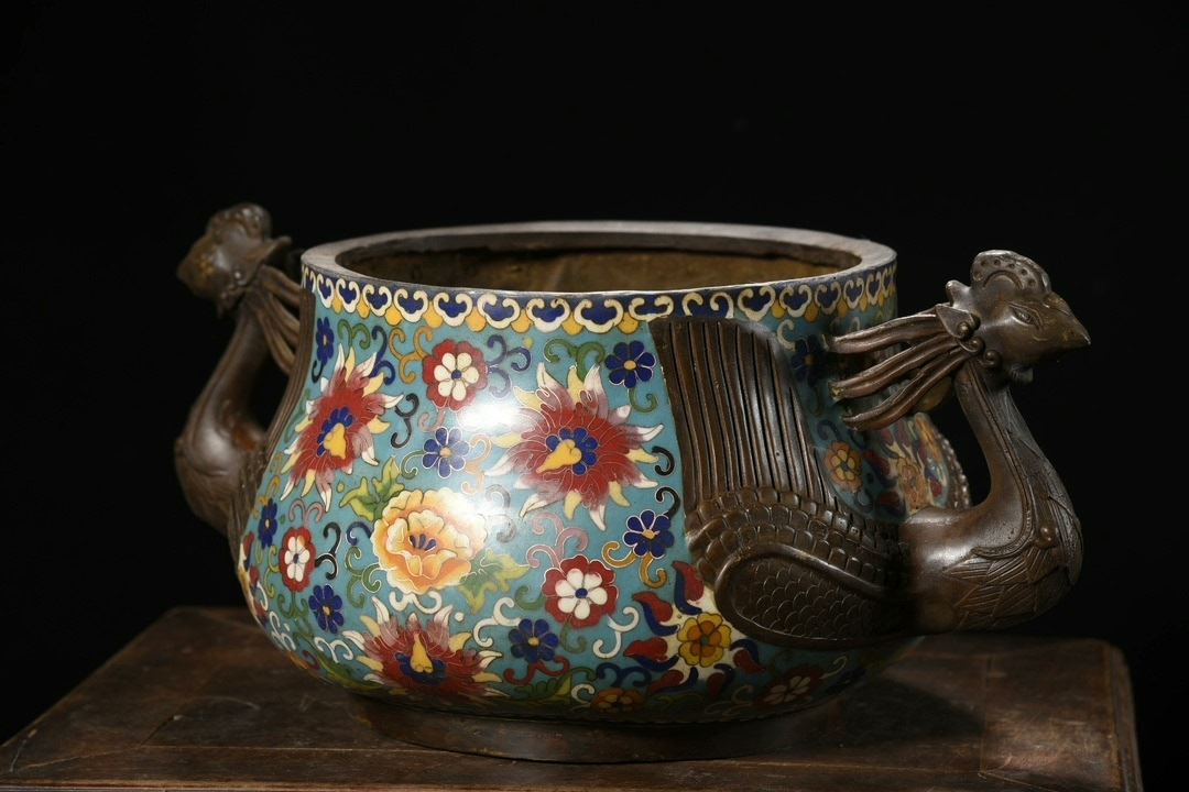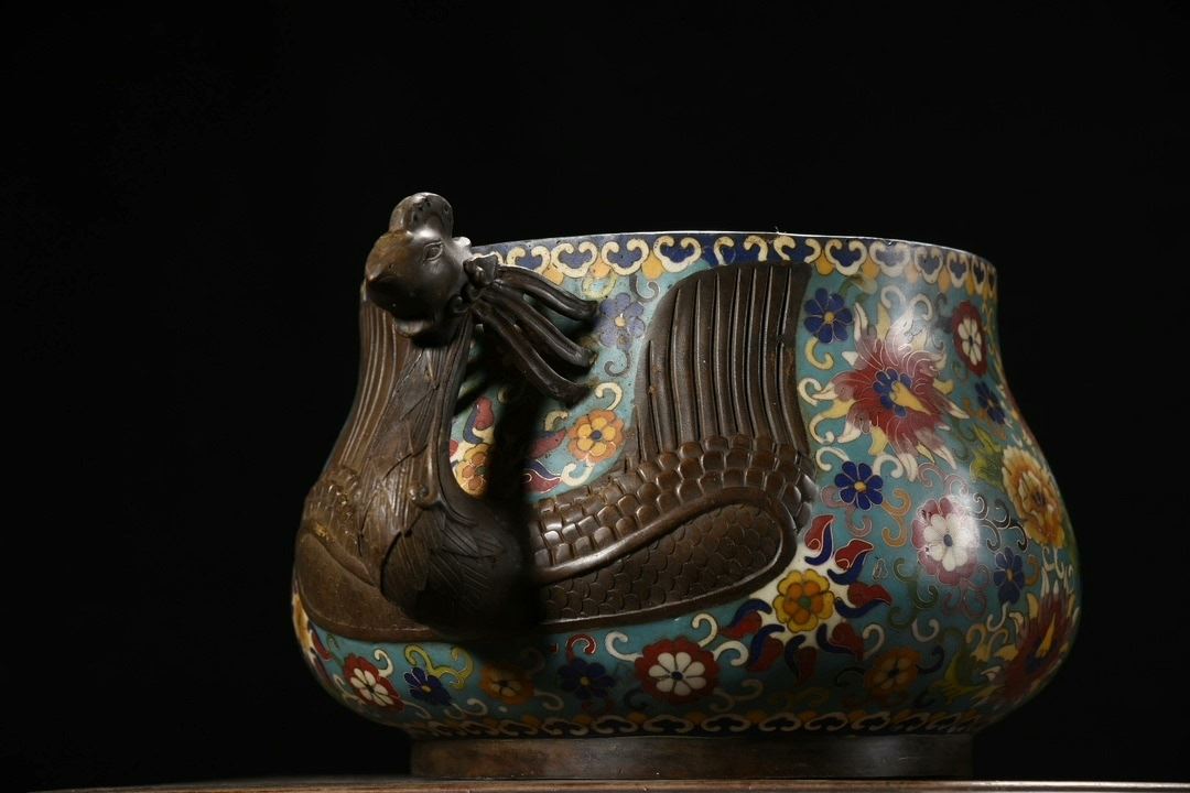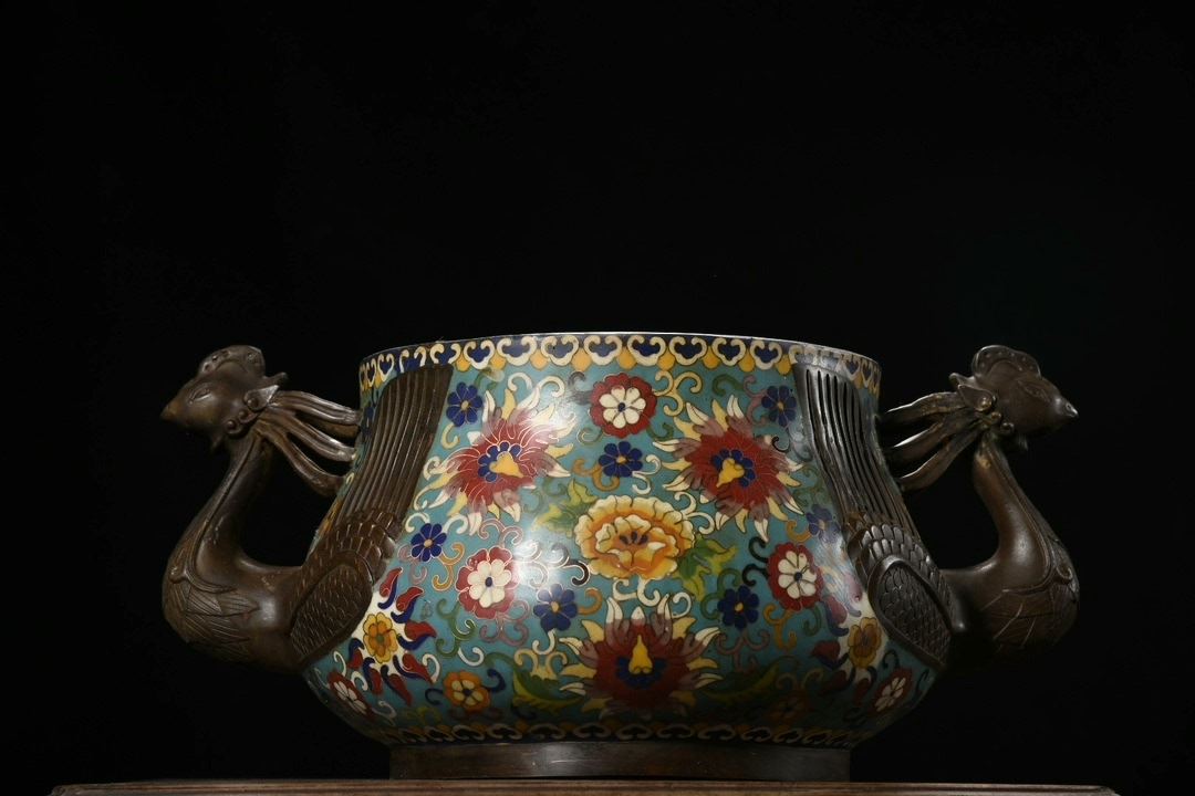 This cloisonné censer features a robust body richly decorated with entwined floral patterns, including blooming peonies and chrysanthemums in vivid, dazzling colors. The twin phoenix handles on each side are gracefully formed, symbolizing auspiciousness and nobility. With a solid and dignified form, the vessel is edged with geometric borders at the rim and base, adding refinement to its design. A masterpiece of cloisonné craftsmanship, it embodies both decorative brilliance and symbolic meaning, making it highly valuable for display and collection.