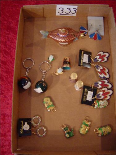These are the last pieces of Cloisonné we have in our store. Includes a 4" Fish Tea Pot, three Chinese Zodiac Thimballs, four pairs of earrings, seven assorted pendants and two Chime Ball Key Chains.