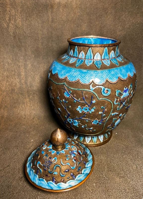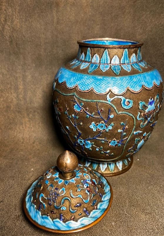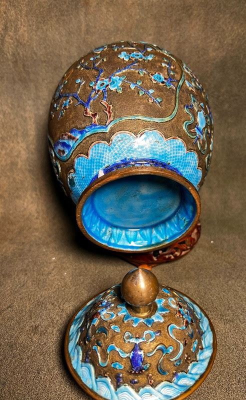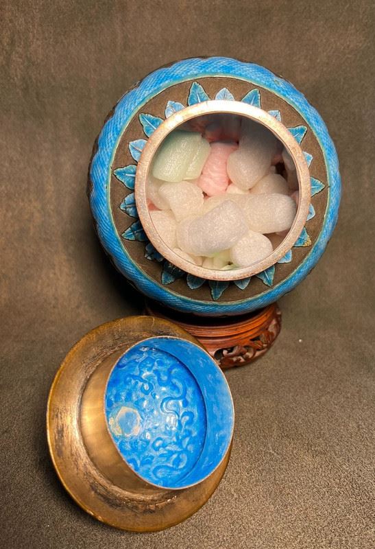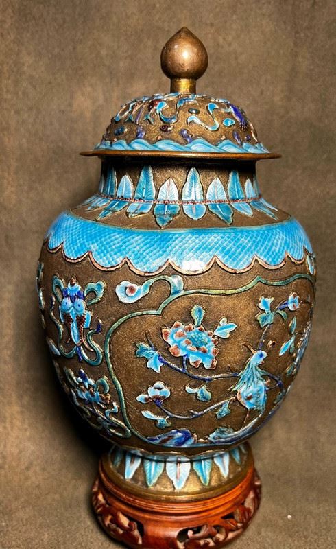 This jar is made with a copper body decorated in cloisonné enamel. The belly is adorned with scrolling floral patterns, with blossoms rendered in vivid blue and turquoise tones. The upper section is highlighted with a textured enamel ground, giving it a rustic yet refined appearance. The lid is surmounted by a rounded knop, completing its dignified silhouette. Resting on a carved wooden stand, this jar served both as a functional container and as an elegant decorative piece in the scholar’s studio or a living hall.