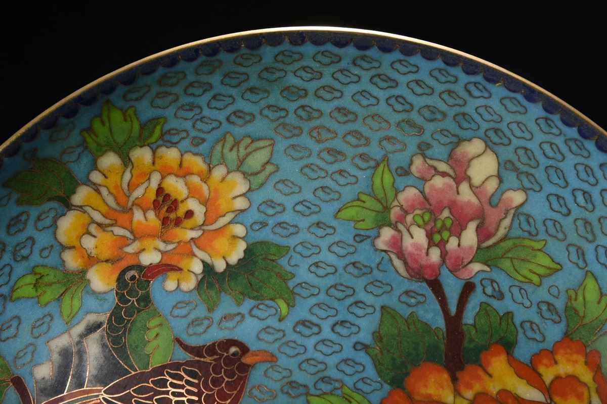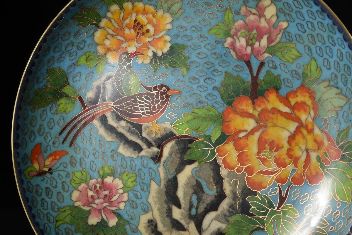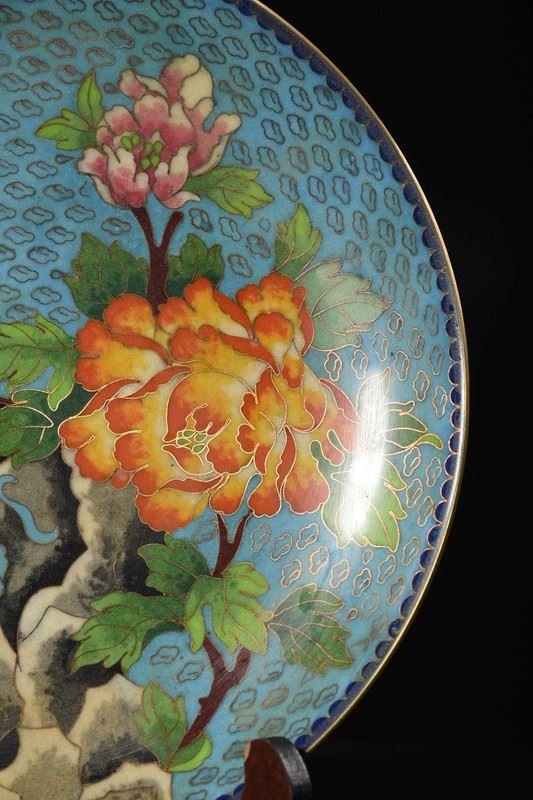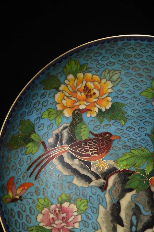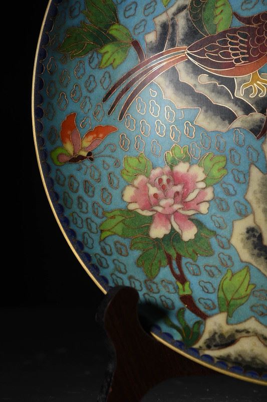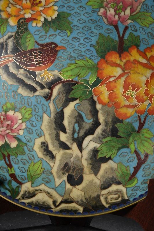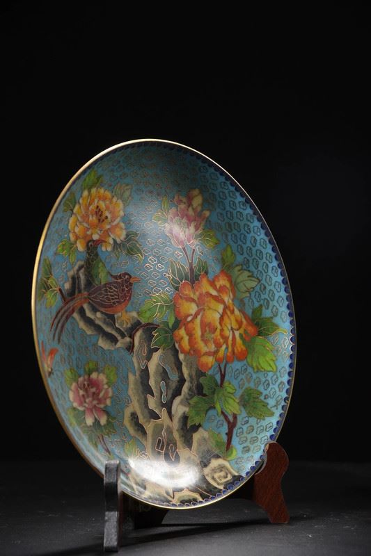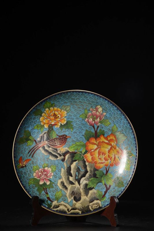 This cloisonné decorative plate features a blue ground adorned with motifs of peonies, rocks, and birds. The blooming peonies symbolize wealth and prosperity, while the lively bird perched on a branch and the fluttering butterfly add vitality to the composition. The patterned blue background enhances the depth and elegance of the scene. With its auspicious symbolism and refined craftsmanship, this plate is a distinguished work of art, ideal for display and collection.