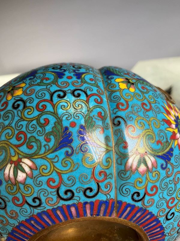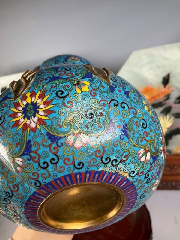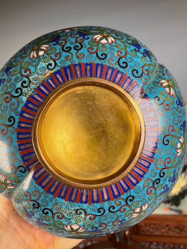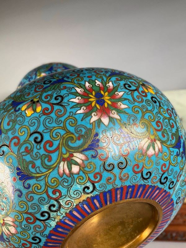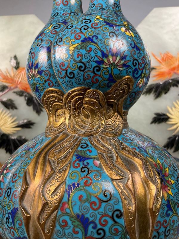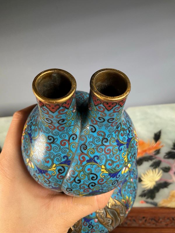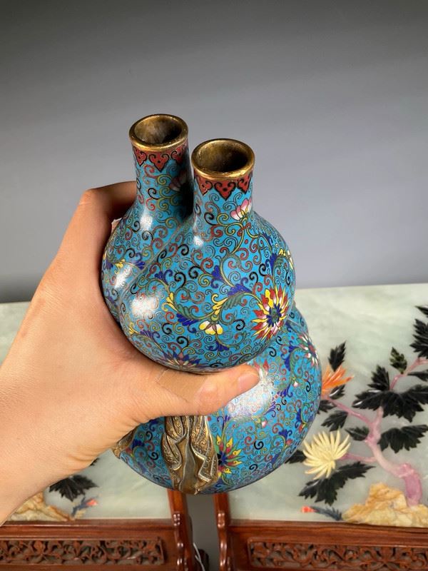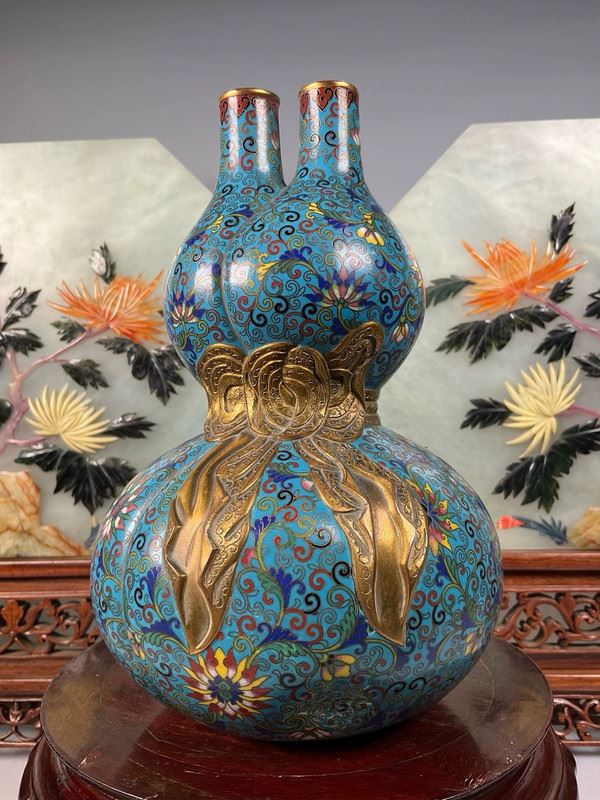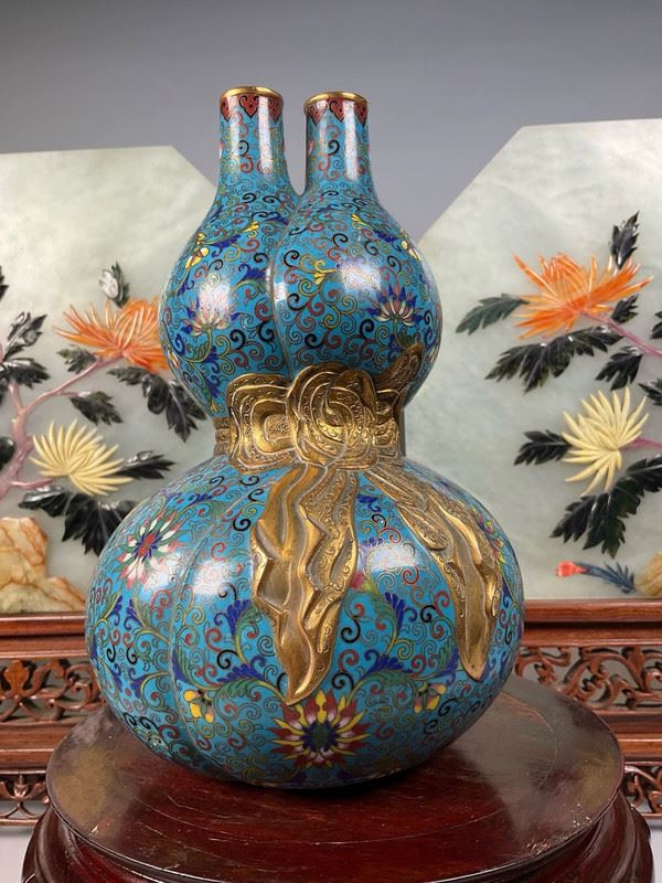 This cloisonné vase is crafted in the form of a gourd, symbolizing blessings and prosperity. The body is richly enameled in turquoise blue with scrolling lotus and auspicious motifs, while the waist is adorned with a gilt ribbon, adding a sense of grandeur. The double-neck design enhances its decorative appeal, making it both a fine display object and a collector’s treasure.