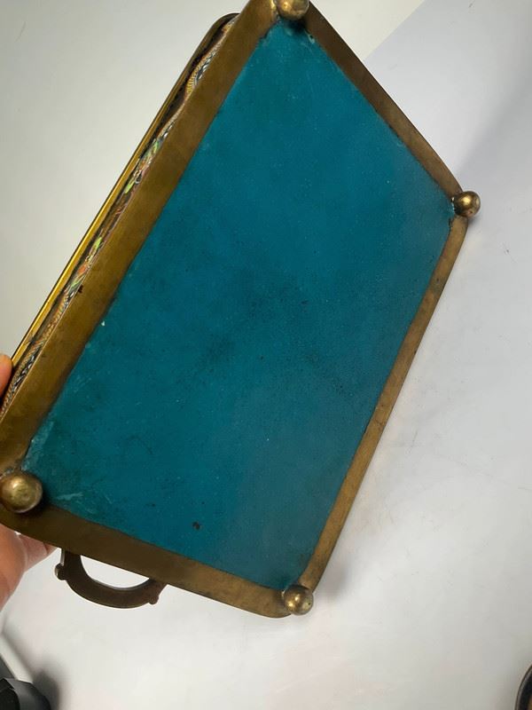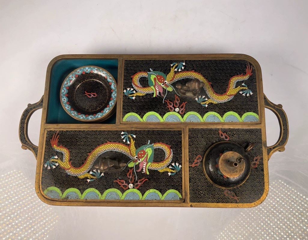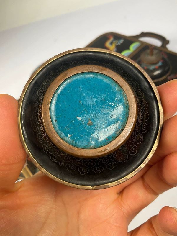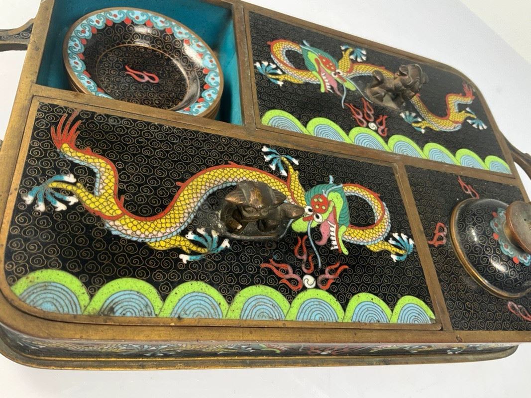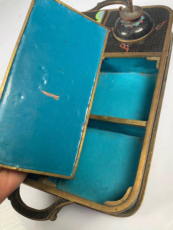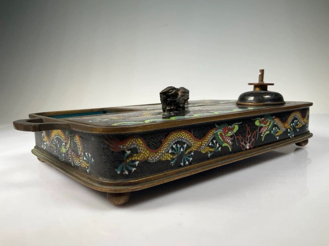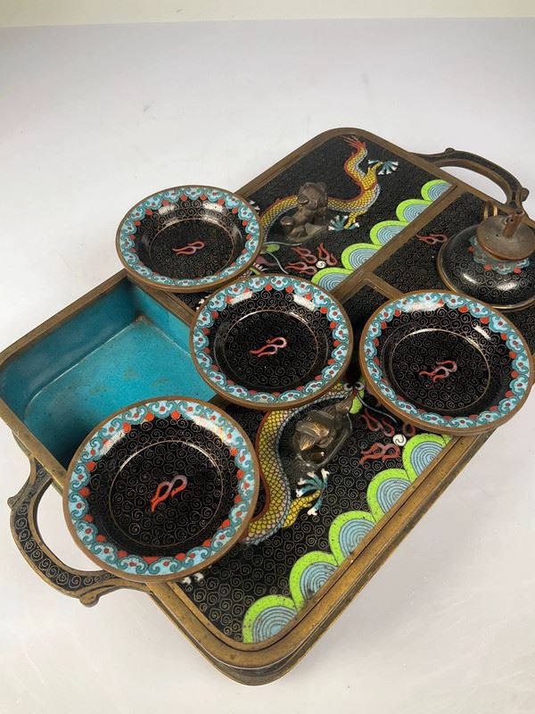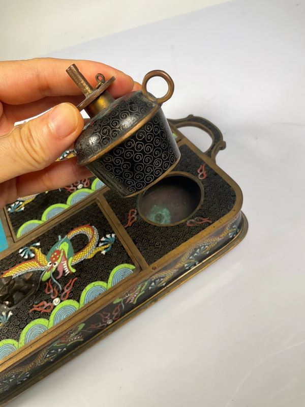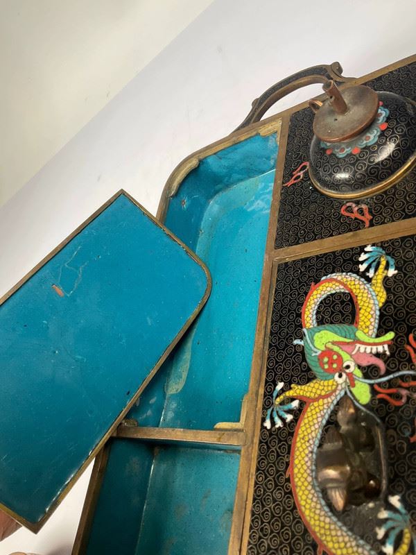 This smoking set is crafted in cloisonné on a copper body, decorated with vivid dragon motifs against a black enamel ground. With its square form, detailed fittings, and elegant ornamentation, it served both as a functional object and a showcase of refined craftsmanship and artistic taste.