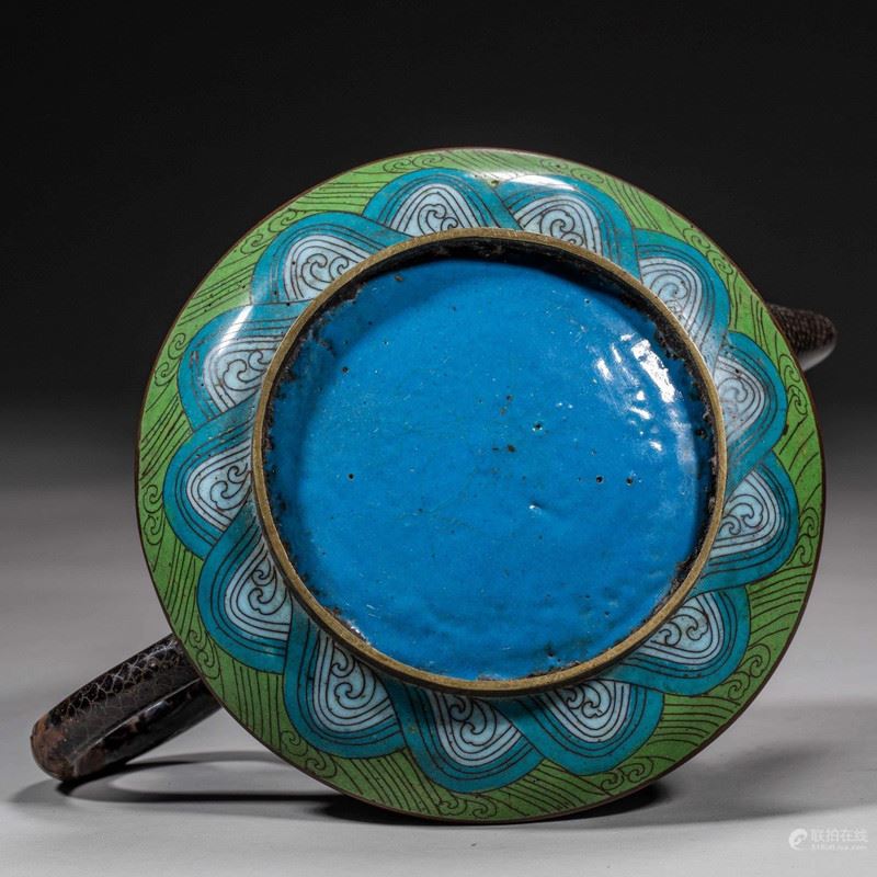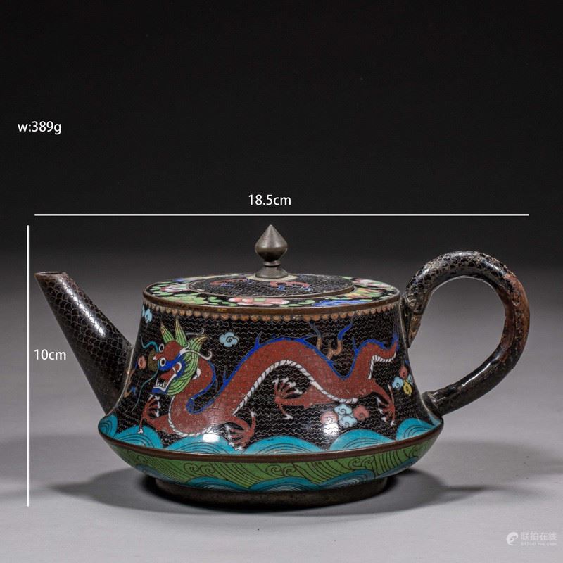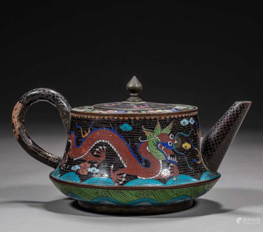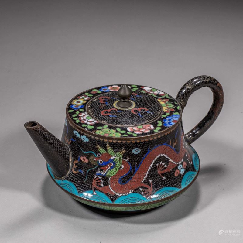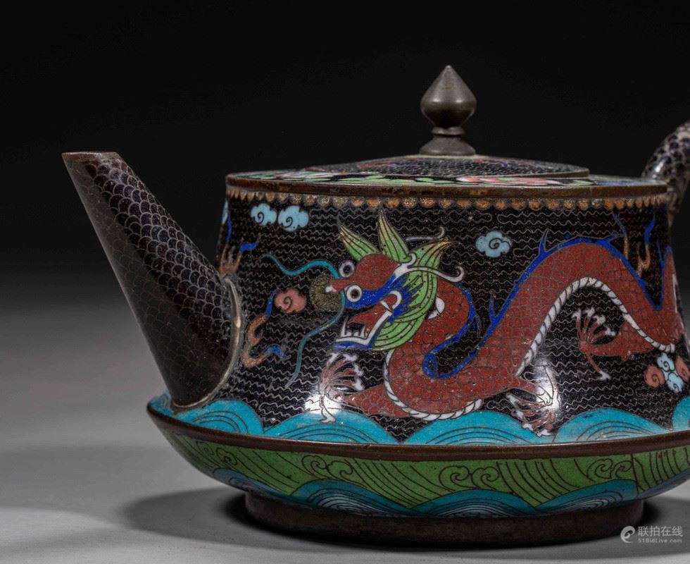 This exquisite cloisonné teapot features a vibrant design of a dragon amidst swirling waves, showcasing the intricate craftsmanship of traditional Chinese enamelwork. The rich colors and detailed patterns capture the essence of Chinese artistry, with the dragon symbolizing power and good fortune. The teapot is elegantly crafted with a dark background, which allows the vivid hues to stand out, making it a striking addition to any collection.