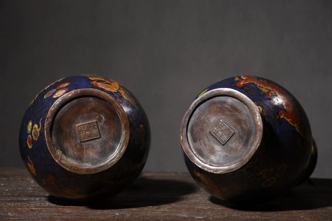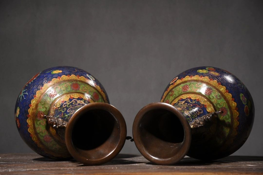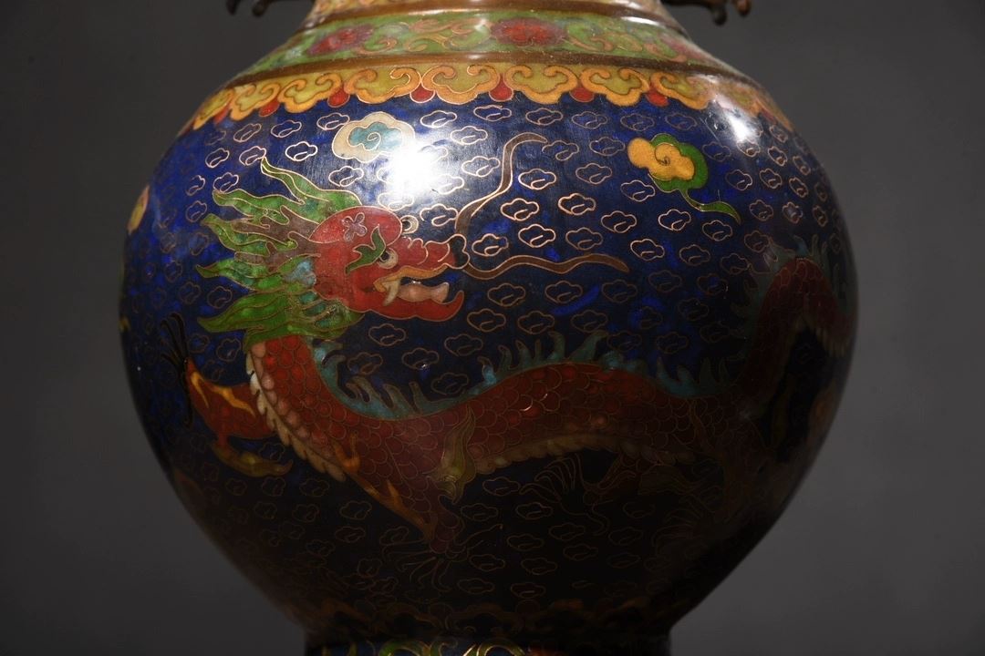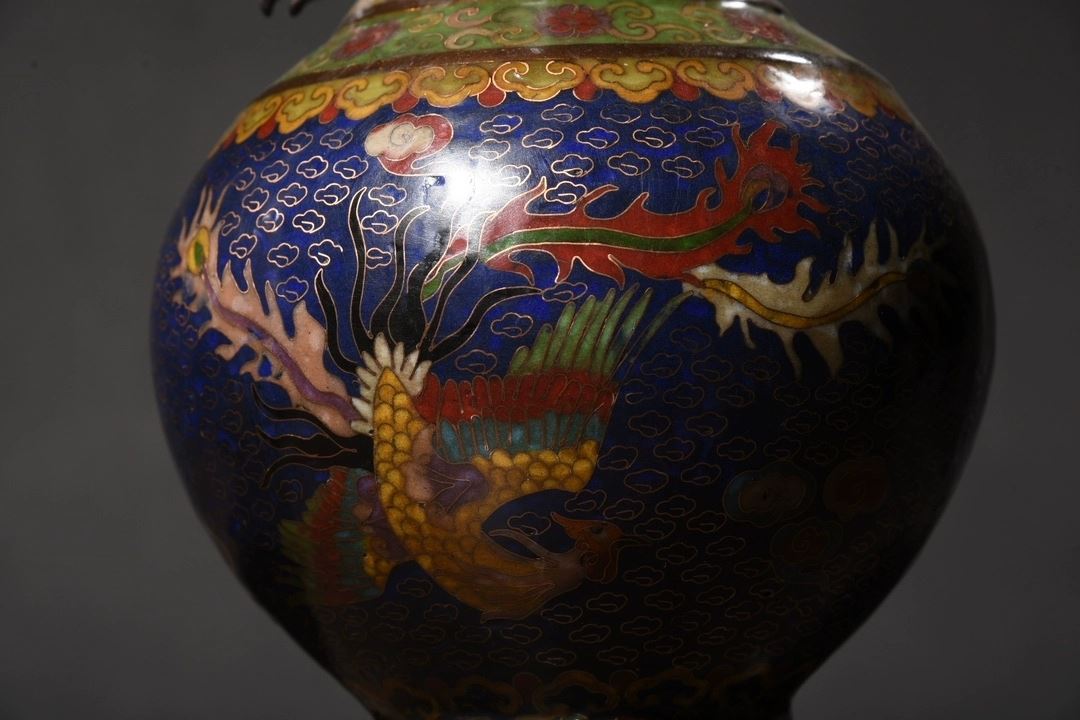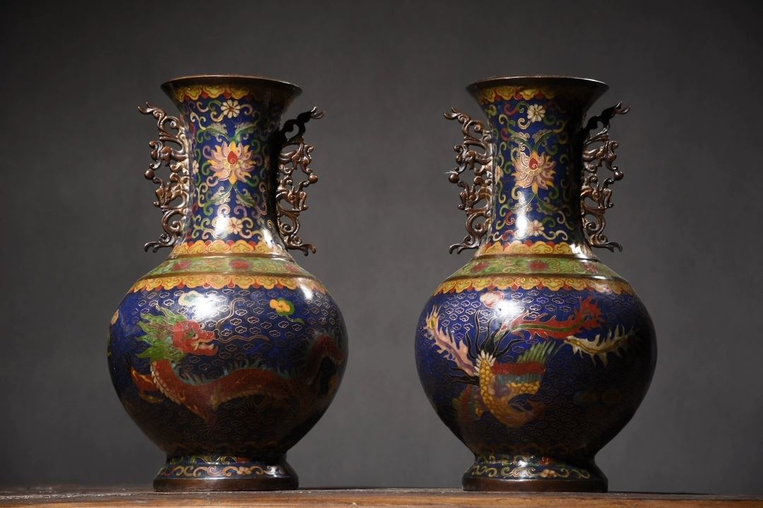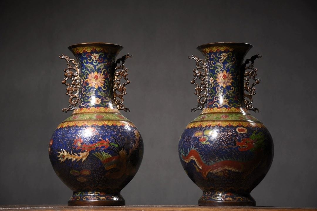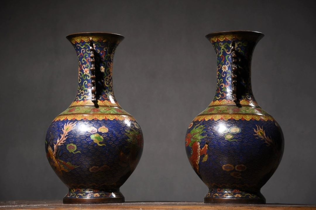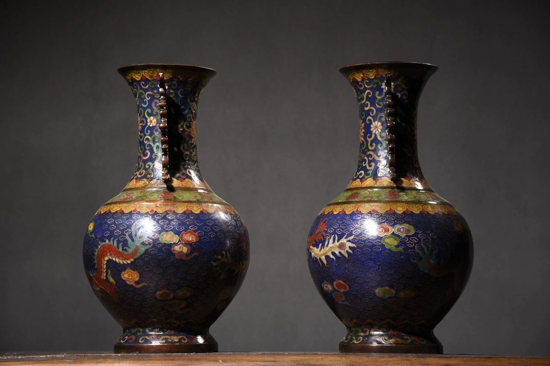 This pair of cloisonné dragon and phoenix "Auspicious Union" dragon-eared vases showcases classic Chinese traditional art and superb cloisonné craftsmanship. The vases feature vivid dragon and phoenix motifs, symbolizing good fortune and authority. The deep blue enamel background, complemented by golden accents, enhances the vibrant colors and dynamic patterns of the dragons and phoenixes. The gilded rims and bases contrast beautifully with the main body, highlighting the intricate craftsmanship. The unique dragon-eared design adds a distinctive element to the form, making this pair a highly collectible work of art with elegant and refined proportions.