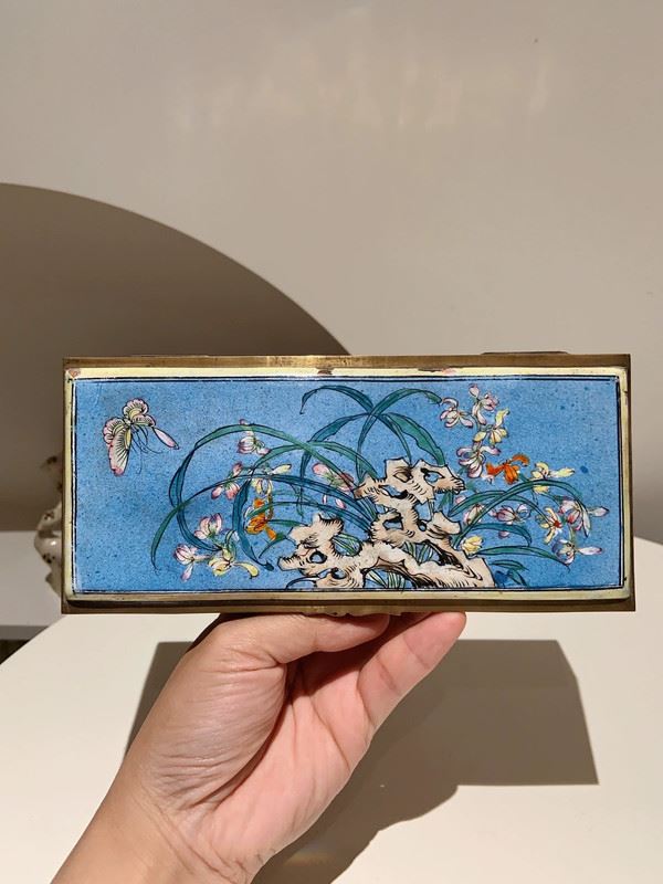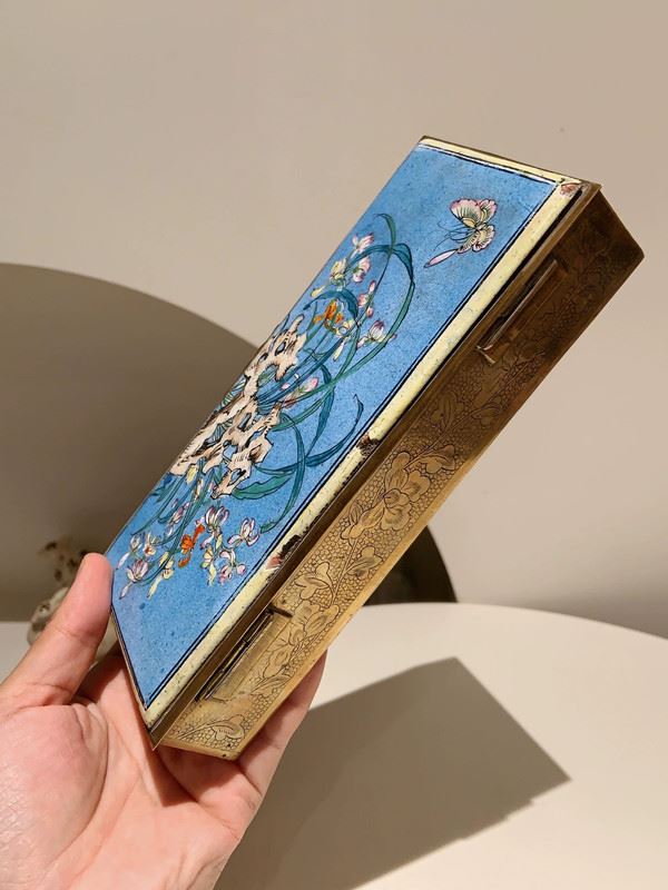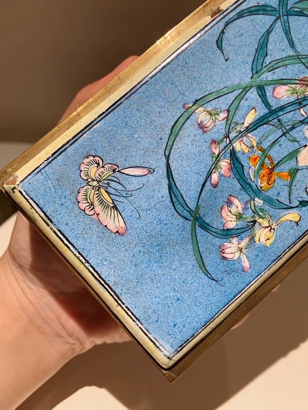 This cloisonné enamel box is adorned with intricate floral designs set against a vibrant blue background, showcasing exquisite filigree craftsmanship. The lid features lively natural elements like orchids and dragonflies, creating an elegant and tranquil artistic atmosphere, making it an ideal piece for collection or decoration.