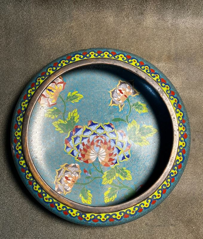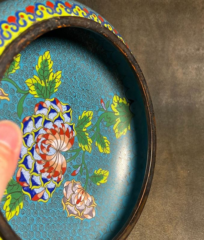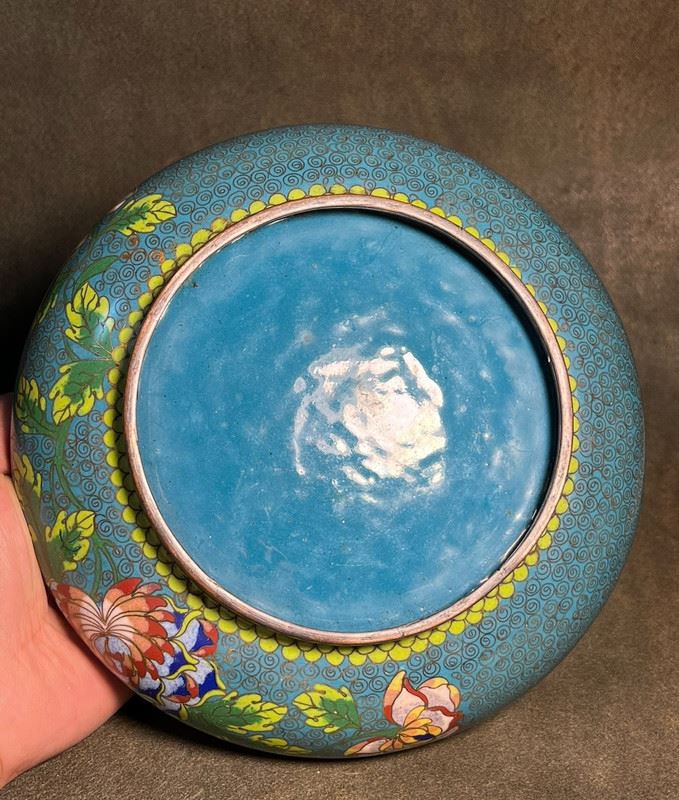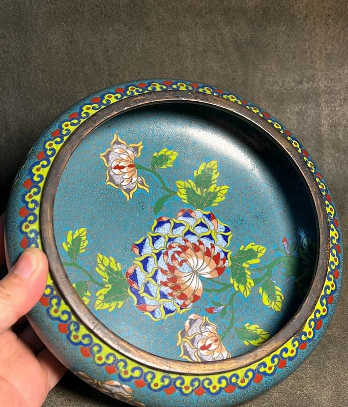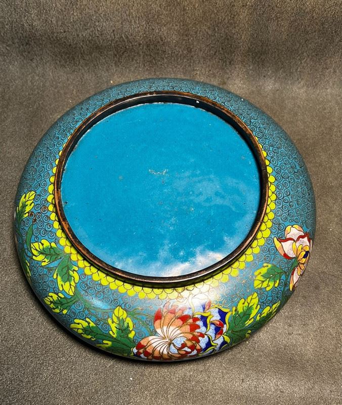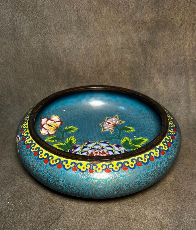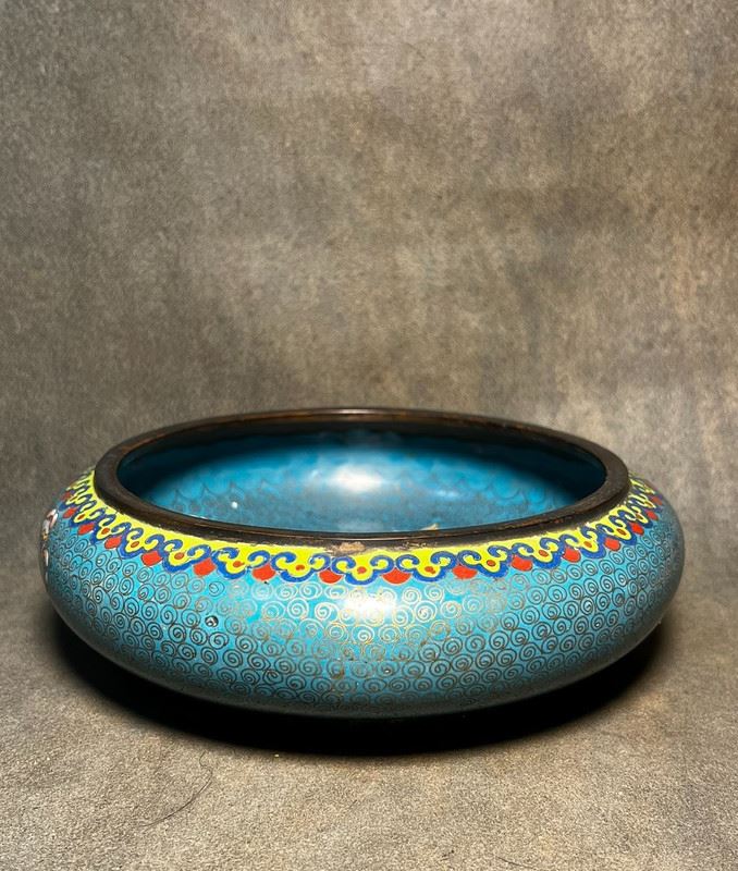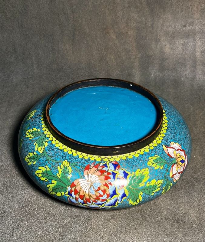 This brush washer is crafted with a copper body and decorated in cloisonné enamel on a turquoise-blue ground. Adorned with colorful floral motifs, it displays refined craftsmanship and vibrant detailing. With its broad, rounded form and plain copper rim, the piece combines practical function as a scholar’s desk object with elegance as a collectible work of art.