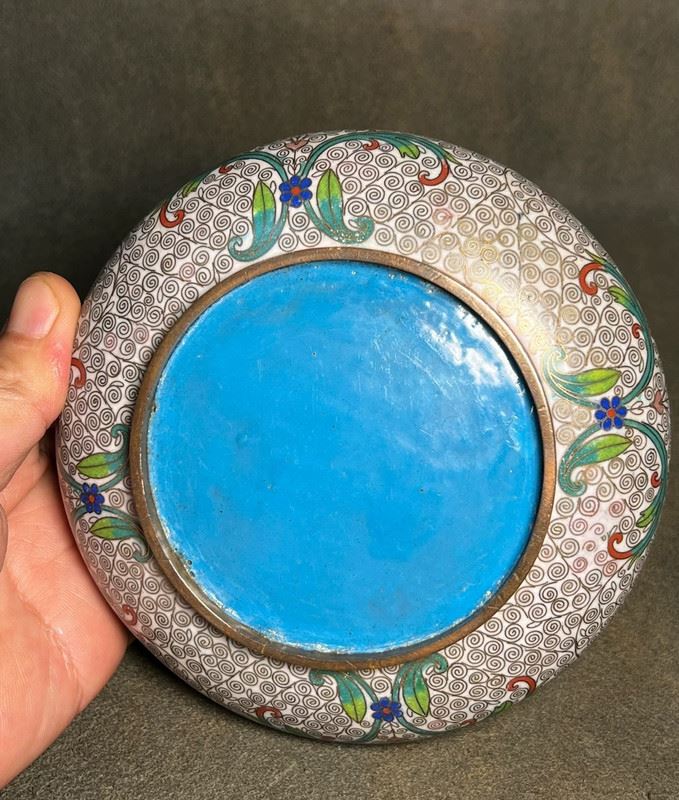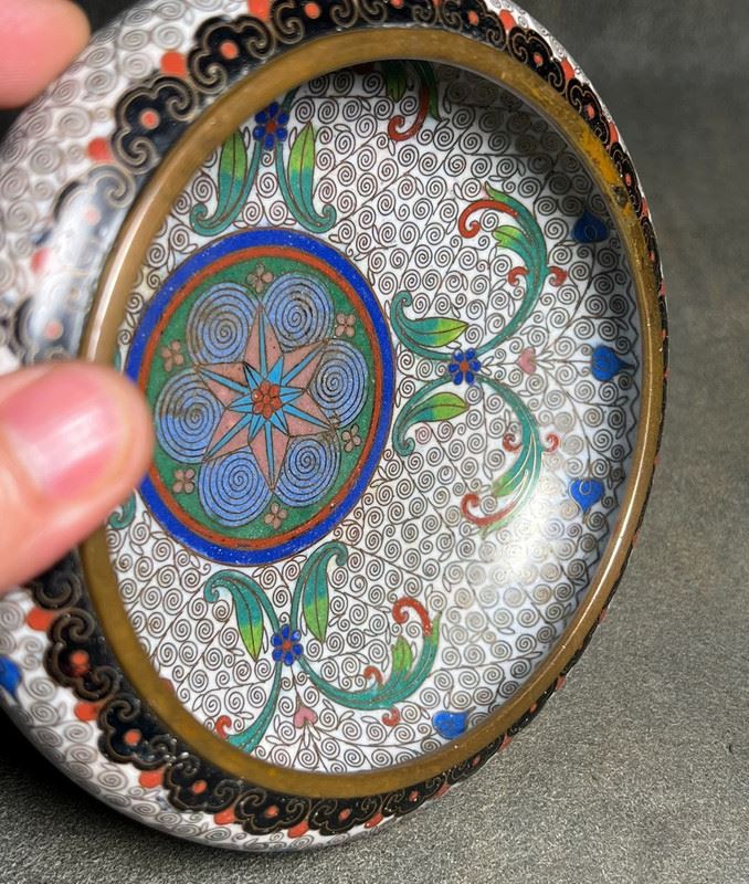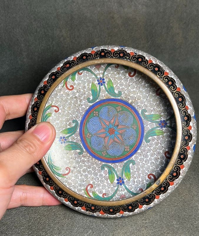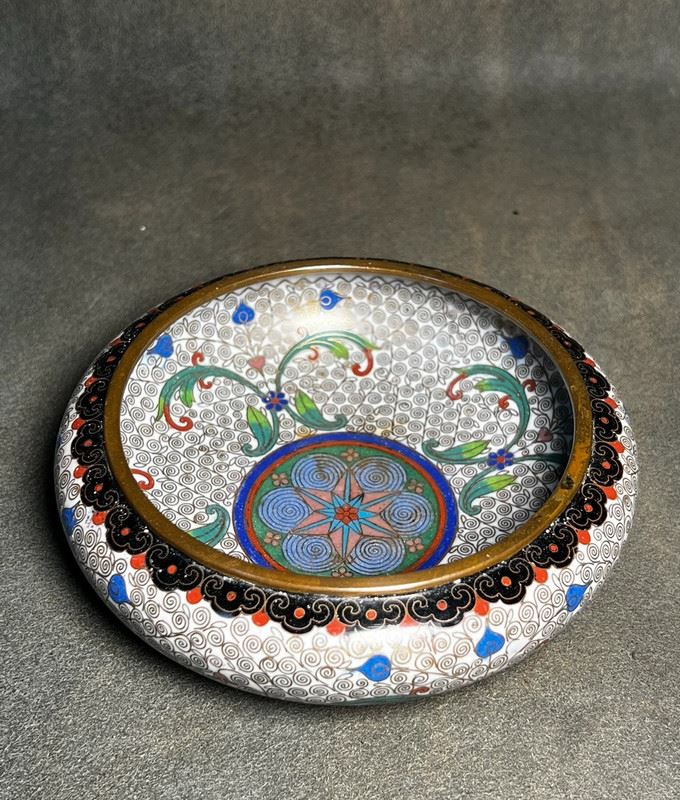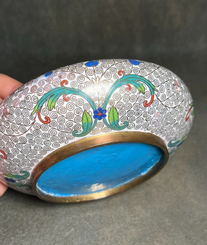 This brush washer is crafted with a copper body and decorated in cloisonné enamel on a white ground. The interior features scrolling floral motifs and a central medallion with geometric patterns in vivid colors. The gilt-bronze rim and the dense spiral patterns on the exterior, together with a black enamel border, enhance its depth and elegance. With its broad, rounded form and refined craftsmanship, the piece exemplifies the artistry of cloisonné as both a scholar’s desk object and a collectible item.