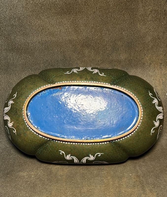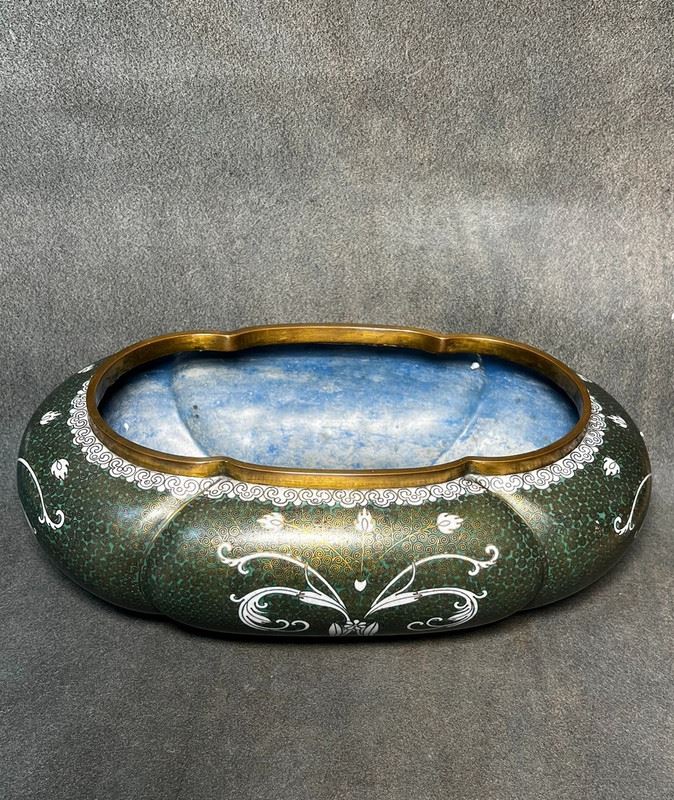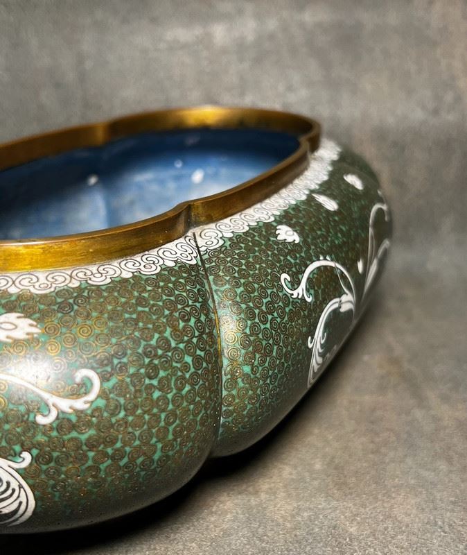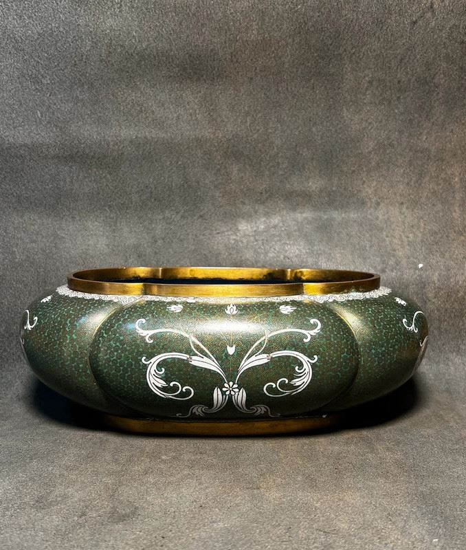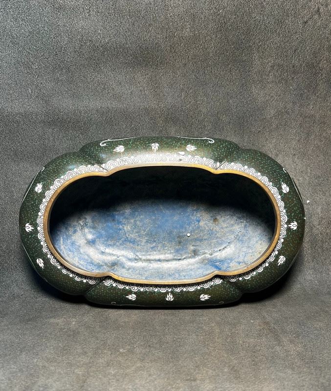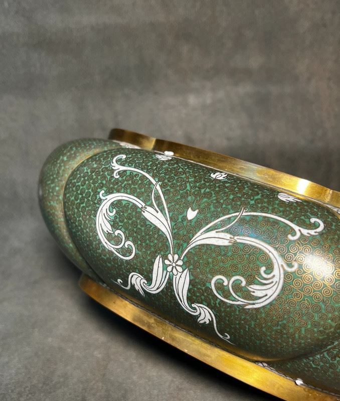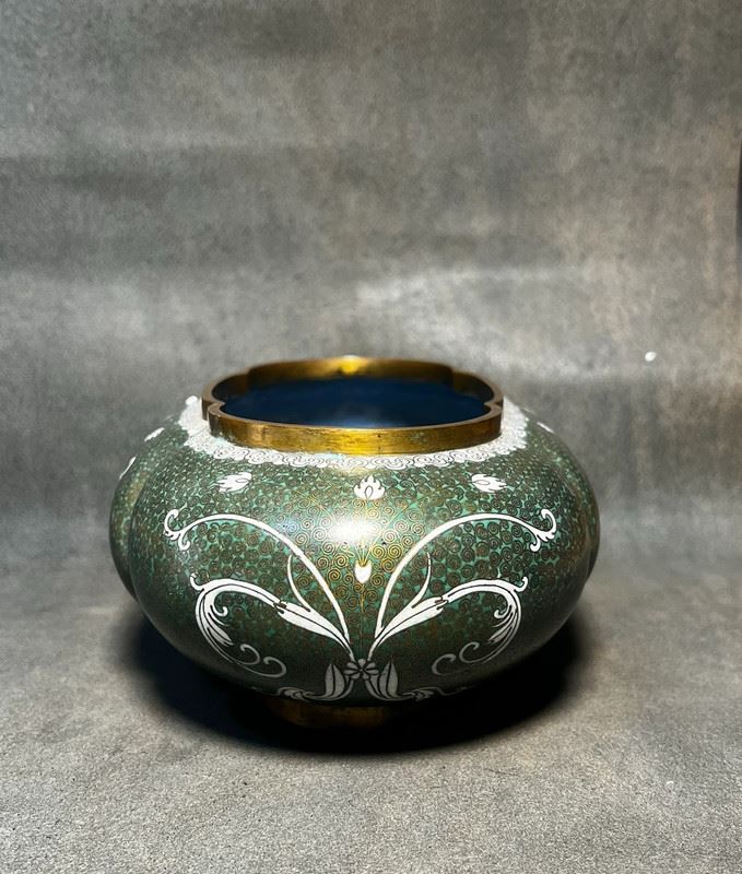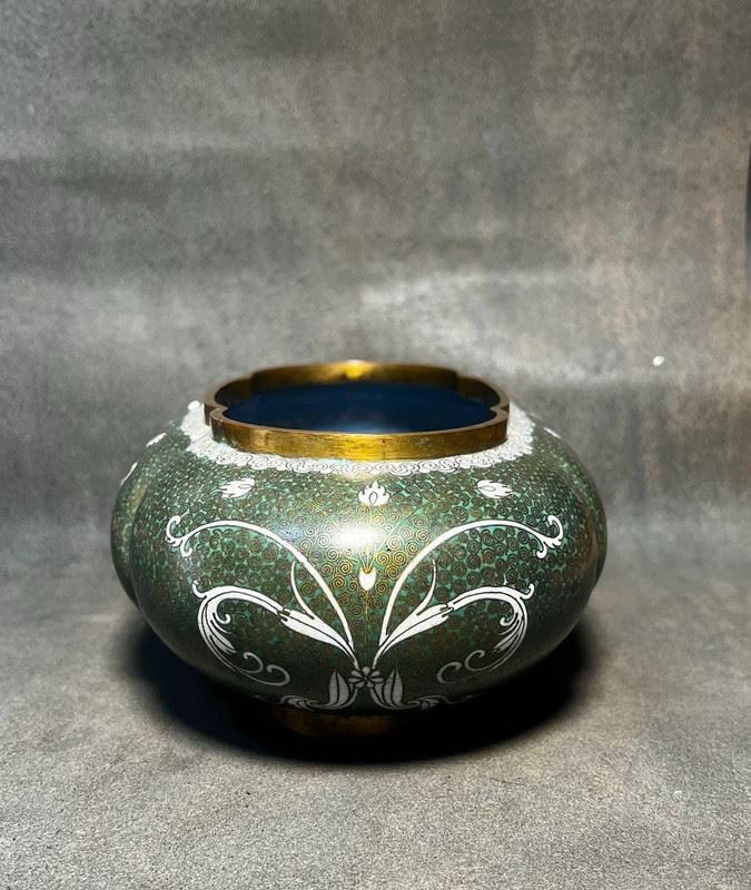 This brush washer is crafted with a copper body and decorated in cloisonné enamel. The surface features a rich green ground with fine patterns, highlighted by elegant white scroll motifs in flowing designs. The gilt-bronze rim and base lend an understated refinement. With its rounded form and sophisticated decoration, the piece served as a functional scholar’s desk object while also holding value as a collectible work of cloisonné artistry.