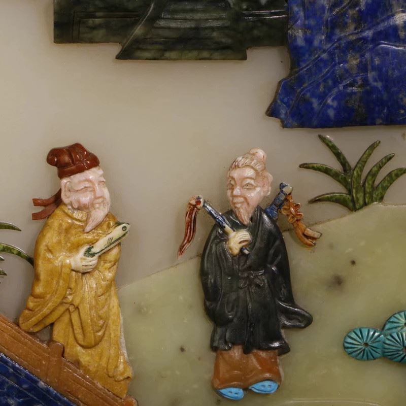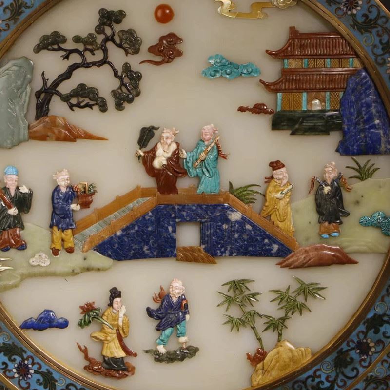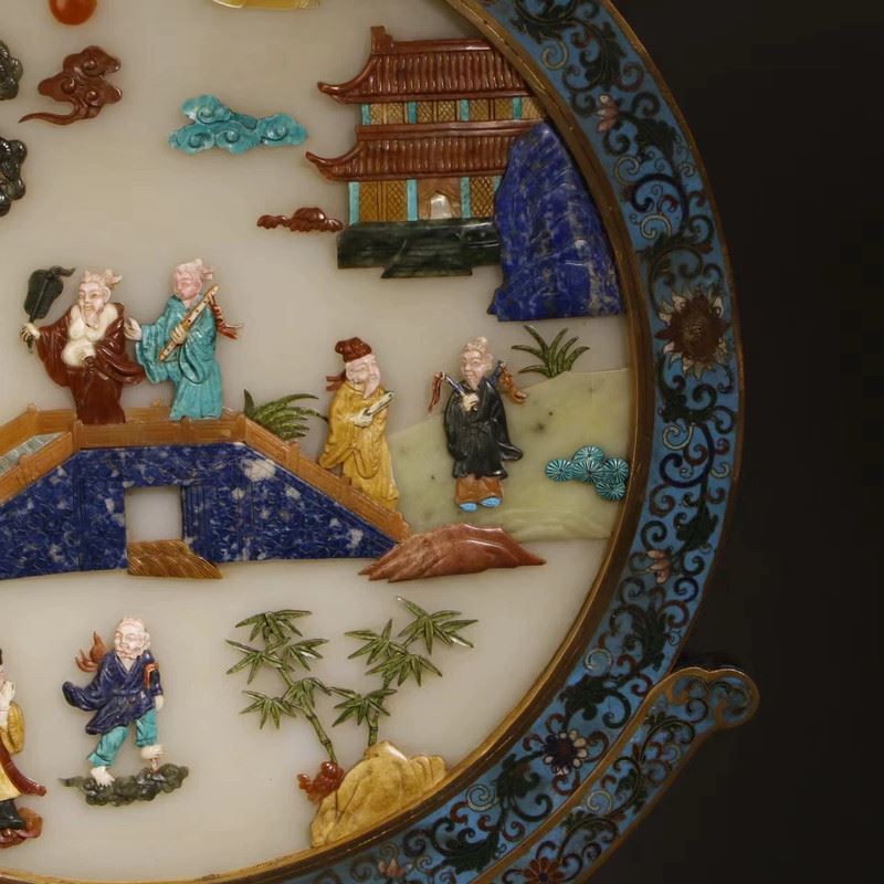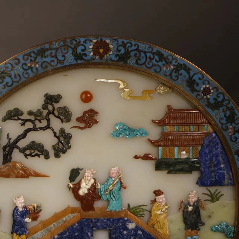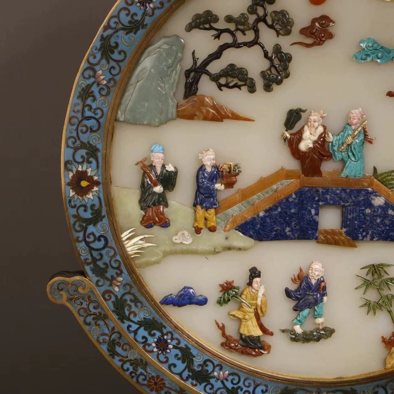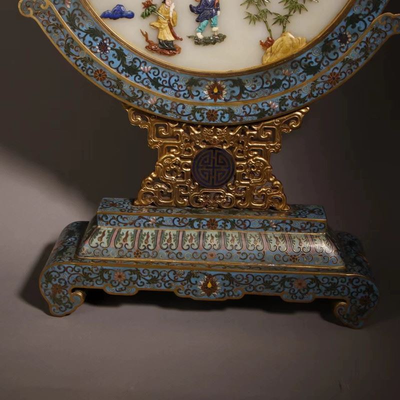 This candle screen is crafted with cloisonné enamel on a copper body, richly decorated with vibrant enamel patterns. The central screen is made of white jade, inlaid with lapis lazuli, agate, jadeite, and other precious stones, forming an intricate scene of pavilions, bridges, landscapes, and figures. The composition is detailed and lively, with figures depicted in expressive poses, symbolizing auspiciousness and elegance.